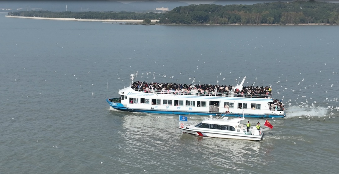 检查之后,交通执法巡逻艇根据巡航计划在相应水域开展巡航游弋。在游船从鼋头渚码头开往太湖仙岛的途中,赵春通过广播和甚高频,对游客和船员给予安全提醒。为了能够更精细化管理,交通执法部门还引入了无人机巡航、电子巡航等多重辅助手段,帮助执法队员及时掌握游船情况,保障游船运营安全。