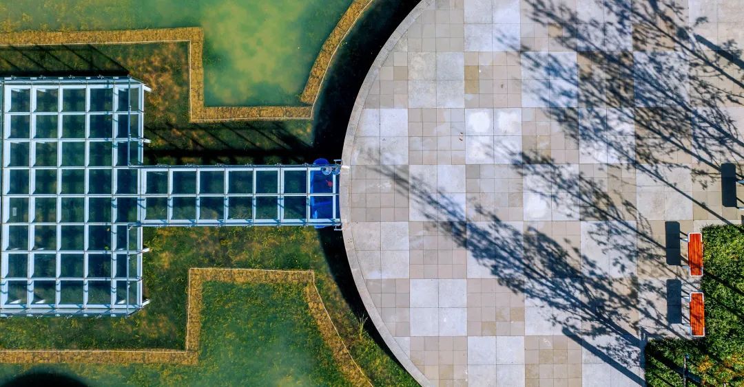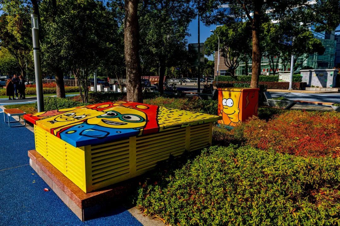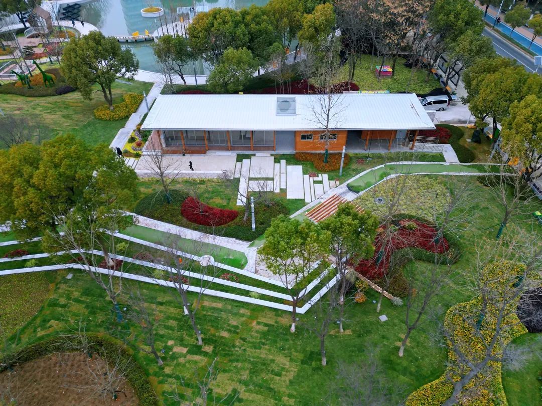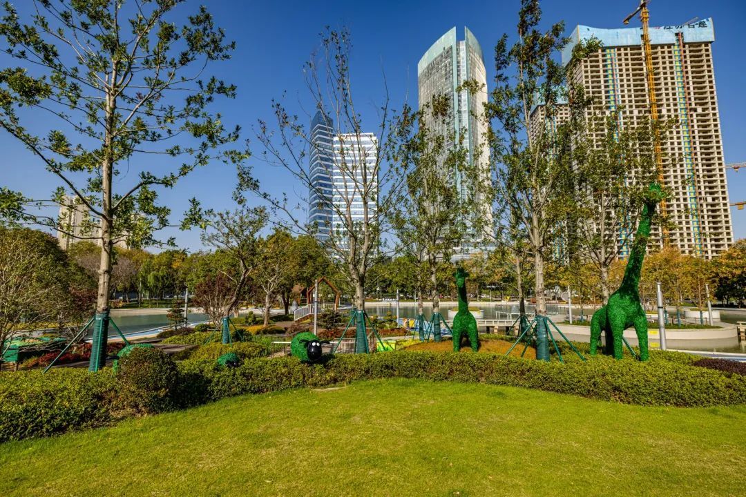 走在色彩明亮的透水铺装步道上,惟妙惟肖的长颈鹿植物雕塑、草坪上立起的树屋、公园中心清澈的池塘、探入水域中央的玻璃栈道、色彩斑斓的游乐区,让人恍若走进奇妙世界。