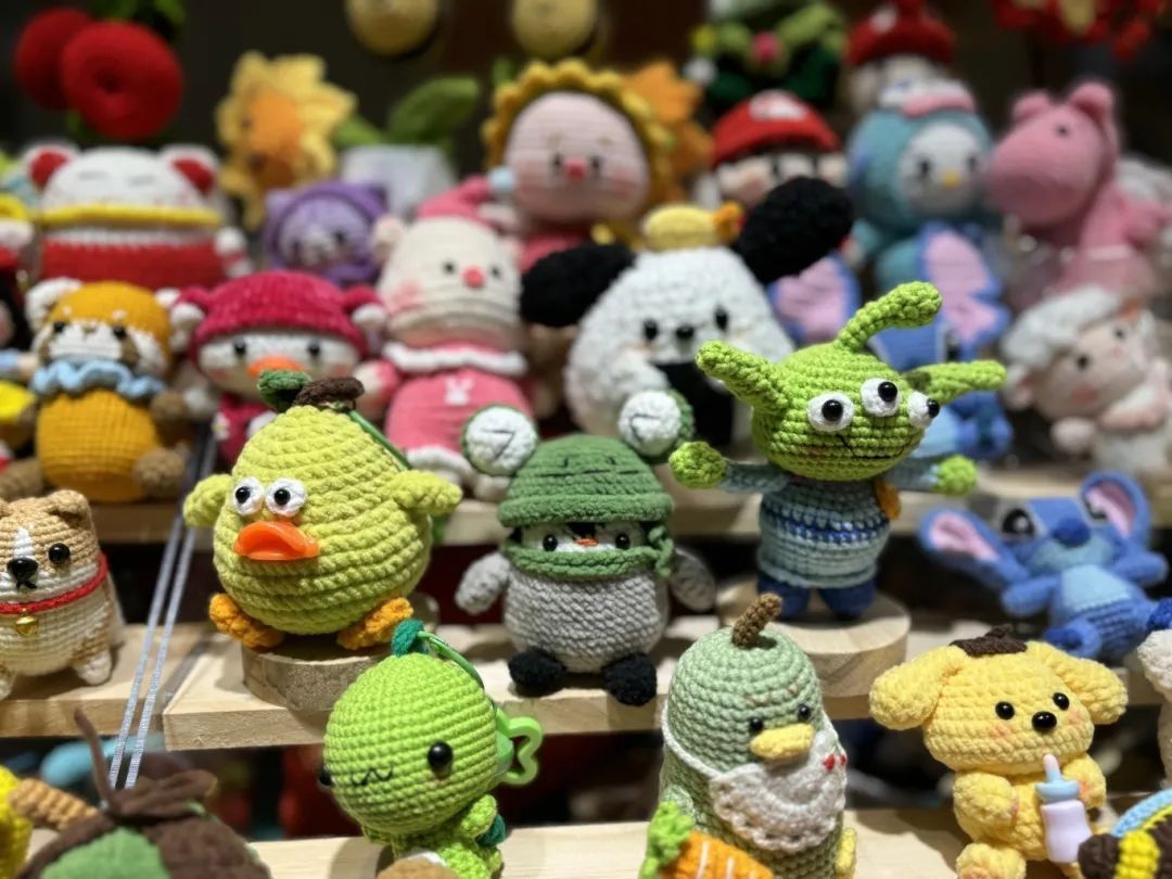 这些玩偶色彩丰富、形态各异。除了玩偶,这里还有针织帽子、背包等手工作品,全都出自摊主一人之手,每一件都显得十分温馨。