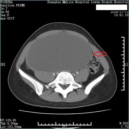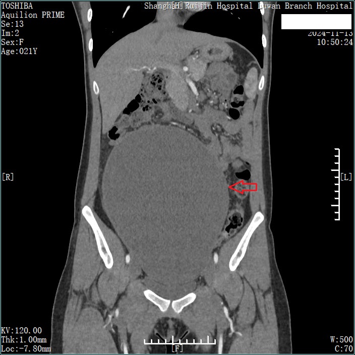 小宁5天前晚饭后突然上吐下泻,家里人以为吃坏肚子了赶紧送到了镇上的医院,结果令所有人大吃一惊,接诊医生发现小宁肚子如孕5月大小,可以摸到腹部巨大肿物,小宁说平时月经都正常,接诊医生安排她进一步检查,超声发现下腹部巨大肿瘤,大小23*15cm,当地医院告知其家属肿块巨大,可能是恶性的,无法手术处理。