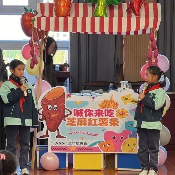 收获的番薯在学生与家长的共同努力下,用于完成另一项任务——烹饪番薯美食。香甜的迷你红薯饼、酥脆的红薯扭扭酥、芝麻红薯条、营养的番薯甜羹、精致的红薯蛋挞……这些美食在其后的美食推广环节一一亮相,让人垂涎欲滴。在学生们翘首期盼的美食品鉴环节,学生们手持品鉴券,作为美食品鉴员穿梭于各个美食小铺之间,挑选着自己心仪的美食。经过激烈的角逐和公正的评选,五年级组凭借“超有料”的甜羹和独特的宣传方式获得了165张品鉴券,荣获本场最具人气的“美味出圈金铺”称号。