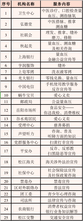 便民服务:中医诊脉、量血压、测血糖、理发、推拿、修鞋、缝补、磨刀、手机使用教学服务、洗衣液零拷、爱心义卖等。