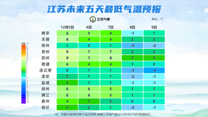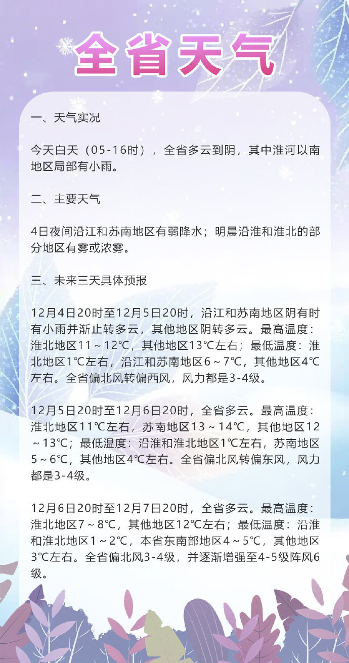未来三天天气预报:4日夜间沿江和苏南地区有弱降水;明晨沿淮和淮北的部分地区有雾或浓雾。