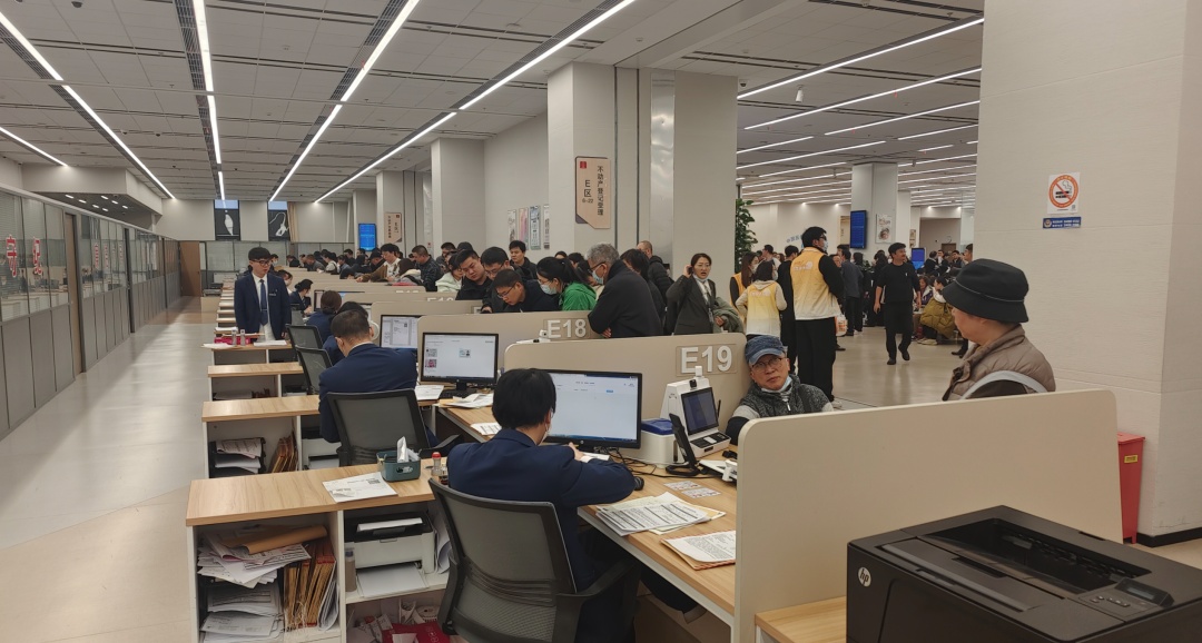 新政实施第一天恰逢周末,区政务服务中心迎来了大量人流。上午七点半,就有人开始排队取号,八点多,二楼的税务窗口人头攒动,等待区域也座无虚席,不少购房者、房东和中介人员都早早来到现场,期待尽快享受到实实在在的政策利好。