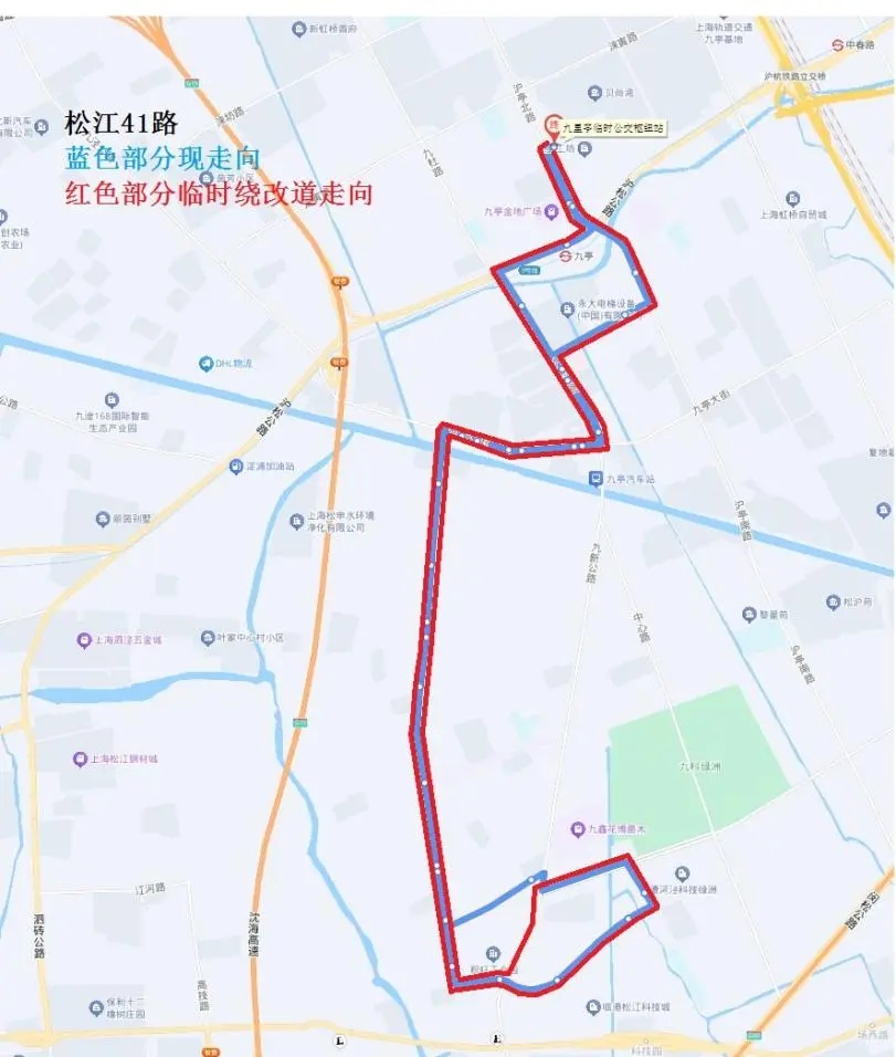 、盛龙路、九亭大街、九新公路、伴亭路、沪亭路、沪松公路、沪亭北路至九里亭临时公交枢纽站(单向)。
