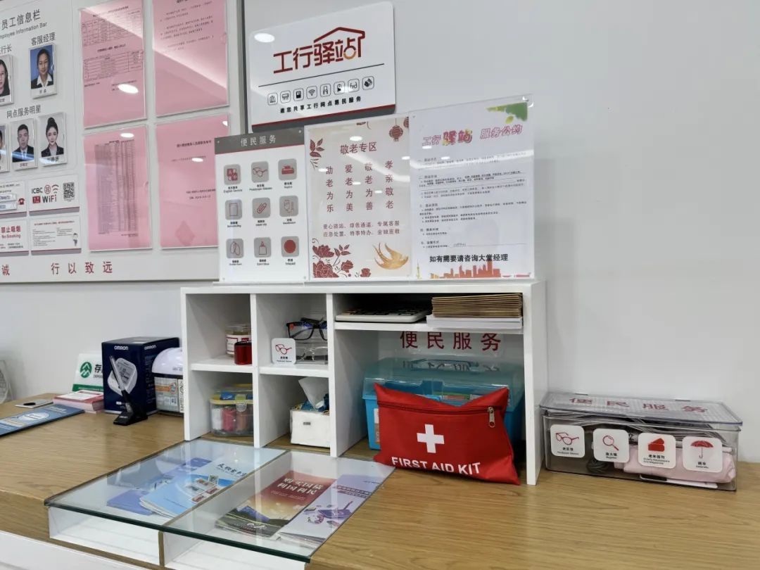 上午十点钟左右,工行杨树浦桥支行内客流如常,其中不乏办理业务的年长者。杨阿姨今年75岁了,每个月领取养老金,查询账户动态,老人家都习惯来到线下办理。自从网点焕新后,室内窗明几净,桌面安装了防撞角,便民服务箱里还有急救包、放大镜老花镜、轮椅拐杖,这一系列变化让杨阿姨心里暖暖的。