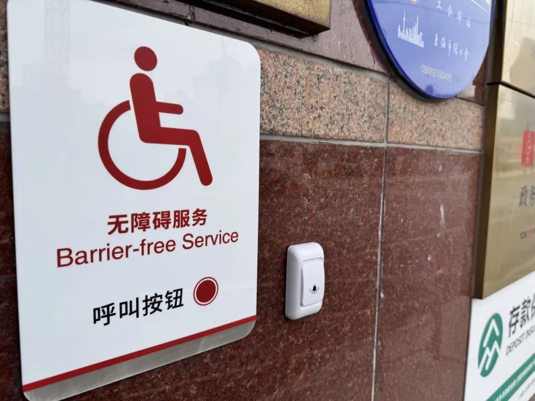 来到杨树浦路1416号,无障碍轮椅坡道直通网点大门,门外贴心设置呼叫按钮,一键传呼就有工作人员前来开门引导。