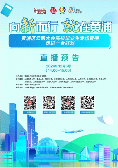 12月5日14:00-15:00,锁定直播,我们不见不散!抓住机遇,开启新征程,黄浦区云聘大会将为您铺就成功之路!职通未来,智启新篇,您的职业梦想,从这里起航!