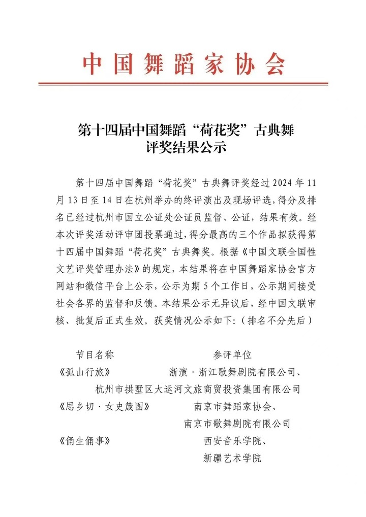 交汇点讯 12月4日,第十四届中国舞蹈“荷花奖”古典舞评奖结果公示。经评审委员会评选和组委会核定,在24部入围终评作品中,拟确定3部作品获第十四届中国舞蹈“荷花奖”古典舞奖,其中南京原创古典舞《思乡切·女史箴图》入选。