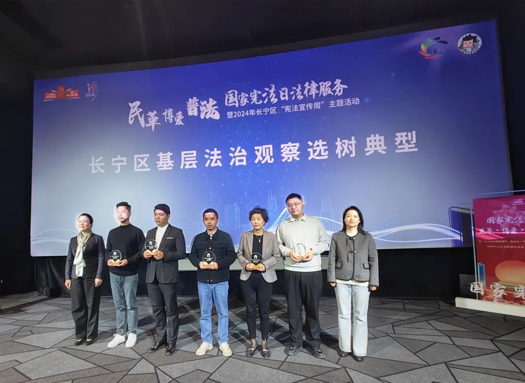 市人大常委会副主任、民革市委会主委徐毅松,市司法局党委书记、局长吴坚勇,市民族和宗教事务局局长、民革市委会副主委陈昶,长宁区委常委、统战部部长王罗清,民革市委会专职副主委翟骏,长宁区副区长陈颖,民革市委会副主委、长宁区人大常委会副主任、民革长宁区委会主委金可可等市区领导出席活动。宪法是国家的根本大法,是治国安邦的总章程。今天是我国的第十一个国家宪法日,宪法日的设立不仅是国家重要的仪式,更重要的是传递依宪治国、依宪执政的法治理念,每一处美好生活的演绎,都离不开宪法坚实的守候;每一条宪法条文,都可以在生活中找到实践的印记。法律是社会稳定的基石,志愿者是法治精神的传播者。今年是民革市委连续第十一年围绕宪法主题开展普法活动,现场,民革区委“博爱”法律志愿者服务队正式成立。民革区委深化“博爱”品牌建设,努力为民革党员服务社会搭建履职平台,此次法律志愿者服务队伍的建立将更加有益于发挥民革党员资源优势,弘扬博爱精神,持续为更多社区居民、企业提供针对性、精准性的法律咨询服务。基层法治观察是上海在法治领域践行全过程人民民主的创新探索。作为全过程人民民主的首提地,长宁始终坚持在实践中发展、在发展中创新,法治萌芽在基层治理中生根发芽、茁壮成长。如今,长宁的基层法治观察工作在破题开篇中求新、在破局纾困中转化,呈现出多元布点、全域观察的良好态势。活动现场,华阳路街道苏河基层法治观察点、天山路街道金虹桥驿家、虹桥街道司法所、程家桥街道司法所、北新泾街道司法所等5个点位获评2024年度“优秀基层法治观察点”。与此同时,“养老社区预收费公证提存资金监管”“完善失智失能独居老人监护机制”“加强跨境电商企业五方面经营风险防范”等10个法治观察建议获评2024年度“十佳基层法治观察建议”。
