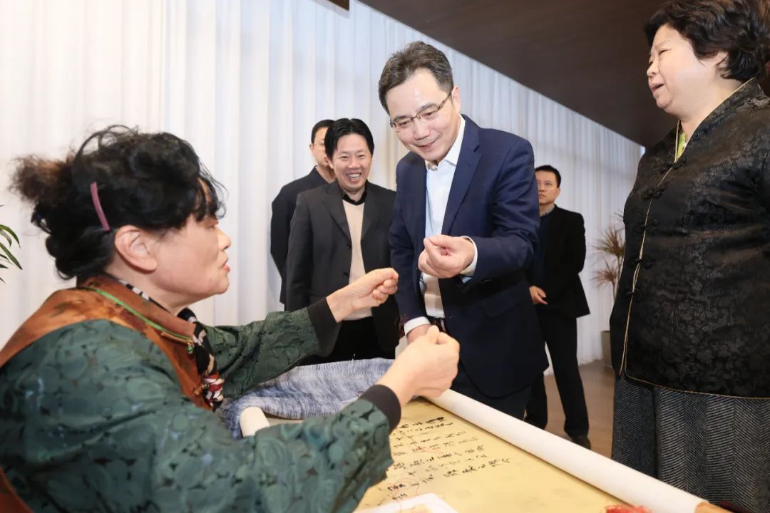 在顾绣研习馆,王华杰听取了顾绣的历史渊源,并与国家级非物质文化遗产传承人钱月芳亲切交流,了解顾绣艺术的传承工作。王华杰鼓励传承人和馆内工作人员持续将传统文化发扬光大,培养更多青年人才,推动非物质文化遗产的保护和发展。