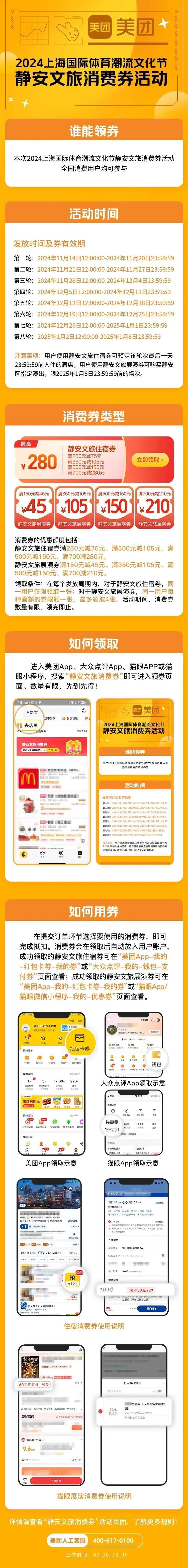 消费券仅支持上海静安区政府指定商户使用;用户使用静安文旅住宿券可预定该轮次最后一天23:59:59前入住的酒店,用户使用静安文旅展演券可购买静安区指定演出,限2025年1月8日23:59:59前的场次。