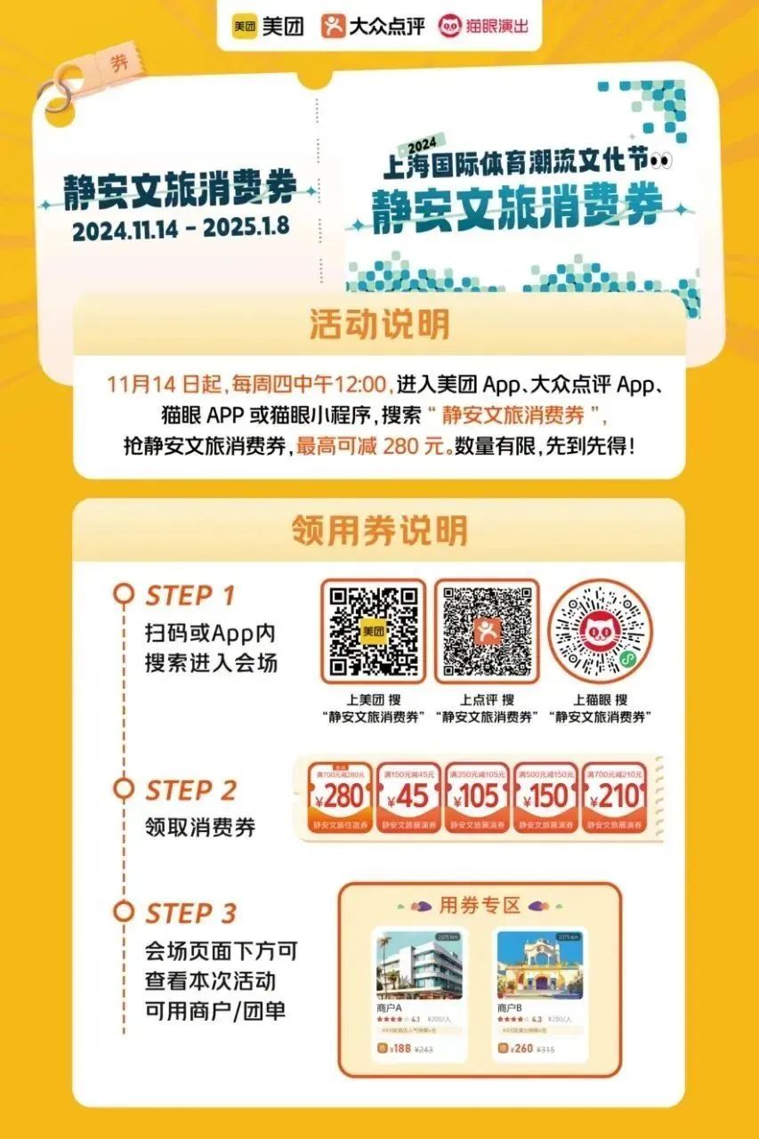 “静安文旅消费券”领取后即可在美团App/大众点评App/猫眼App及其小程序上预定参与商户产品。