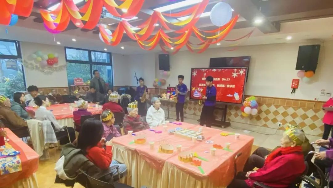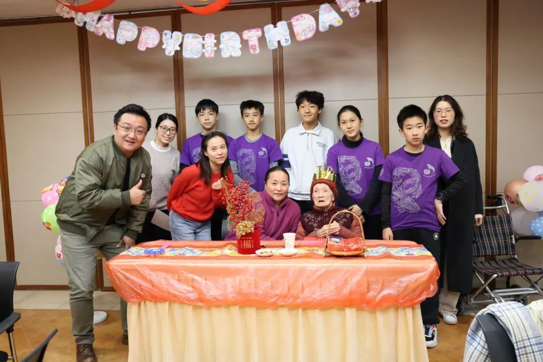 初冬时节,虽寒意渐浓,各色彩带和气球将三福院一楼多功能厅布置得分外喜气,12月生日的老人们都戴着生日皇冠,手拿着打拍器,和来自上海中学国际部的同学们齐聚一堂,共同庆生。