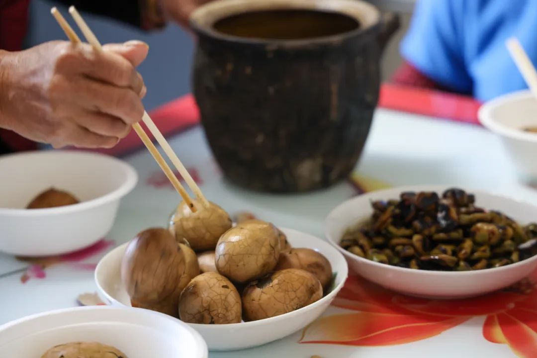 菜卤蛋、菜卤豆、菜卤芋头……12月2日上午,在朱泾镇大茫村,村民围在一起,用土灶头和砂锅煨煮出一道道特色美食,迎接即将到来的大雪节气。