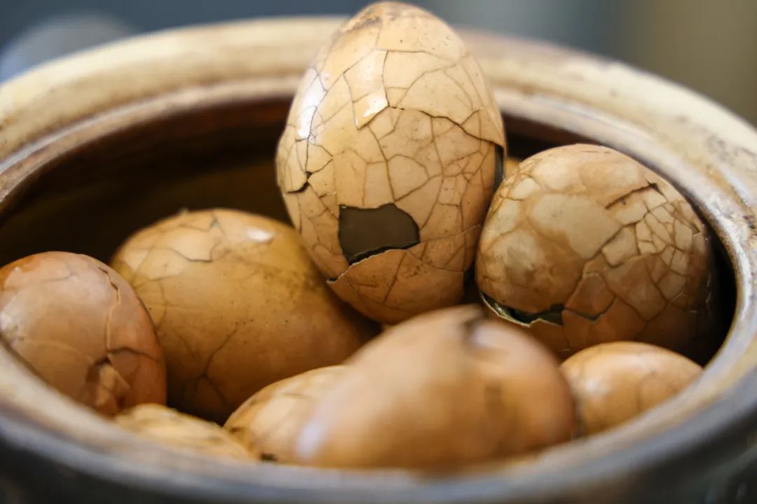 剥去蛋壳,渗透的菜卤在蛋白上形成好看的花纹,尝上一口,味道鲜美,口感滑嫩。
