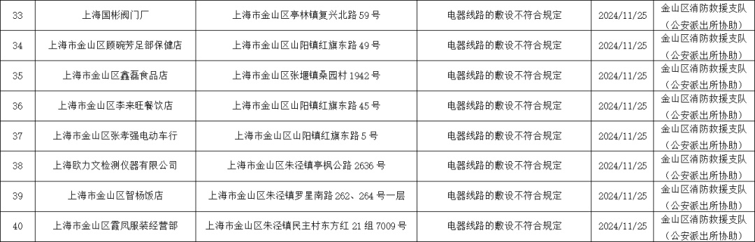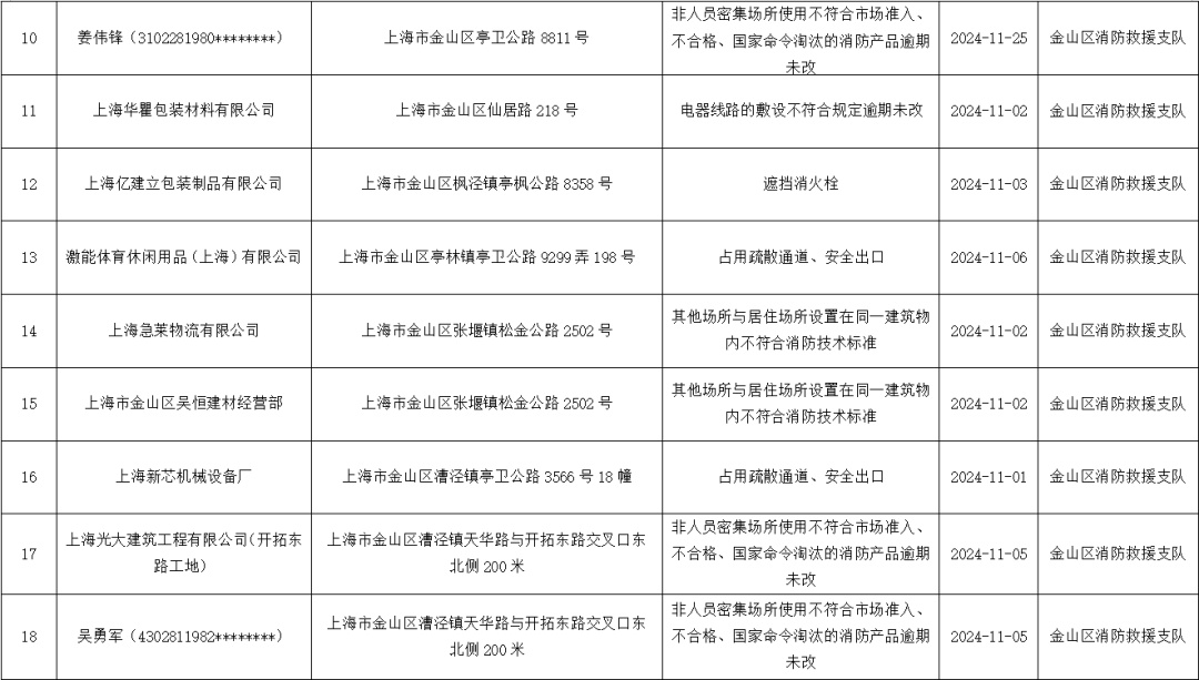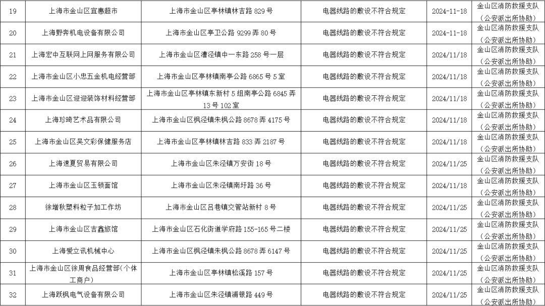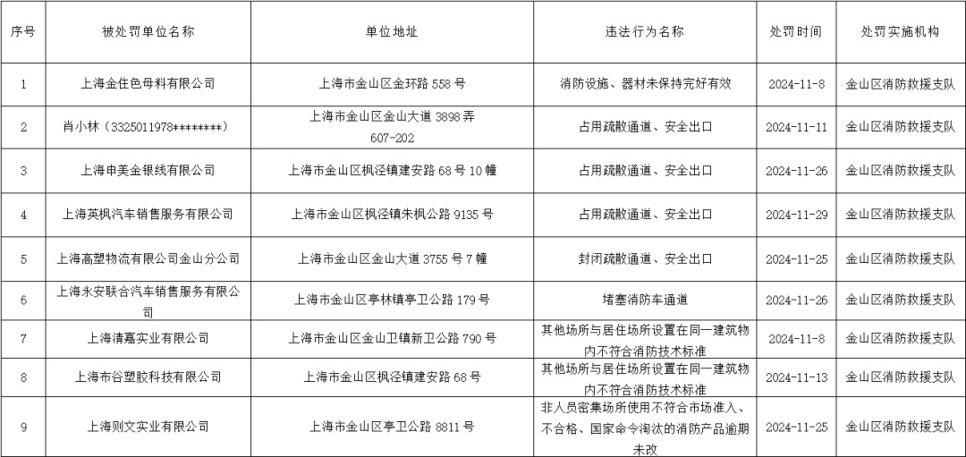 根据《上海市行政处罚案件信息主动公开办法》内容要求,现将金山区消防救援局11月1日至11月31日行政处罚信息公开,详细名单如下: