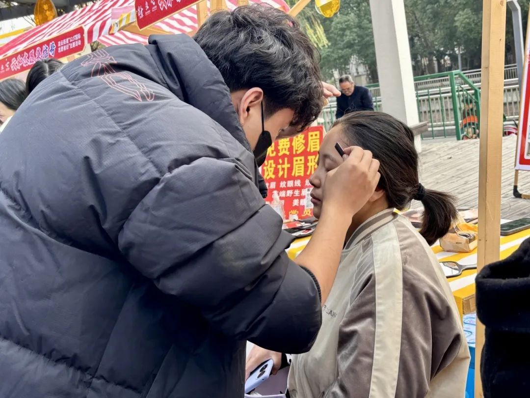 “这里的老师技术很棒,服务很好,我很相信他们。”在修眉摊位前,于阿姨对着镜子中的新眉形赞不绝口。一旁的志愿者们手持专业工具,耐心地倾听阿姨们对于眉形的需求和期望,并根据她们的脸型、年龄及个人风格提出建议,力求让每个人都能找到适合自己的眉毛造型。