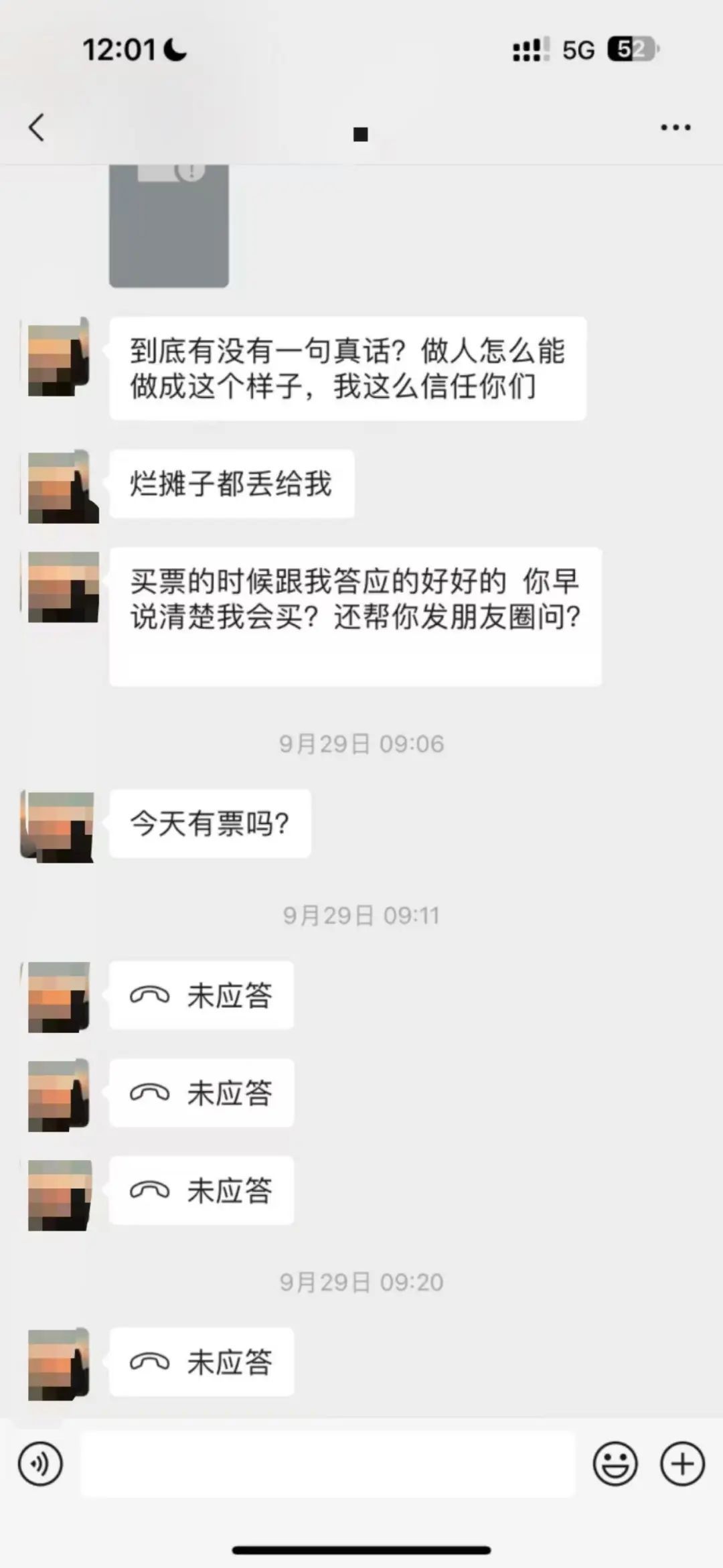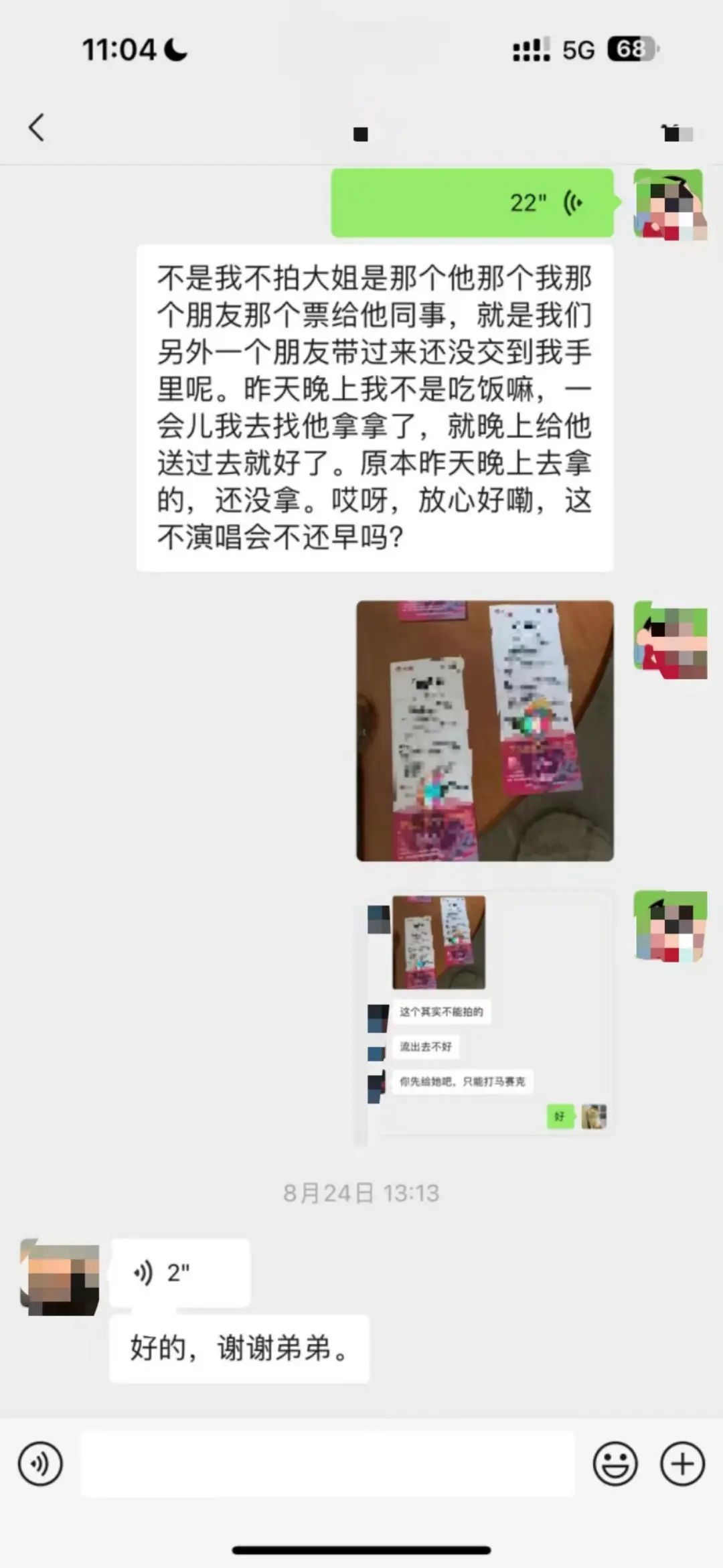 兴奋之余,曹女士还把自己购得演唱会门票的喜悦发布到了朋友圈,受人之托又购买了几张内场及前排门票。眼看演唱会日期越来越近,但是门票却一直未送到手中,曹女士心中焦虑,由于好几张票还是自己代朋友购买,垫付了不少资金,她便多次催促韩某及工作人员寄送门票。