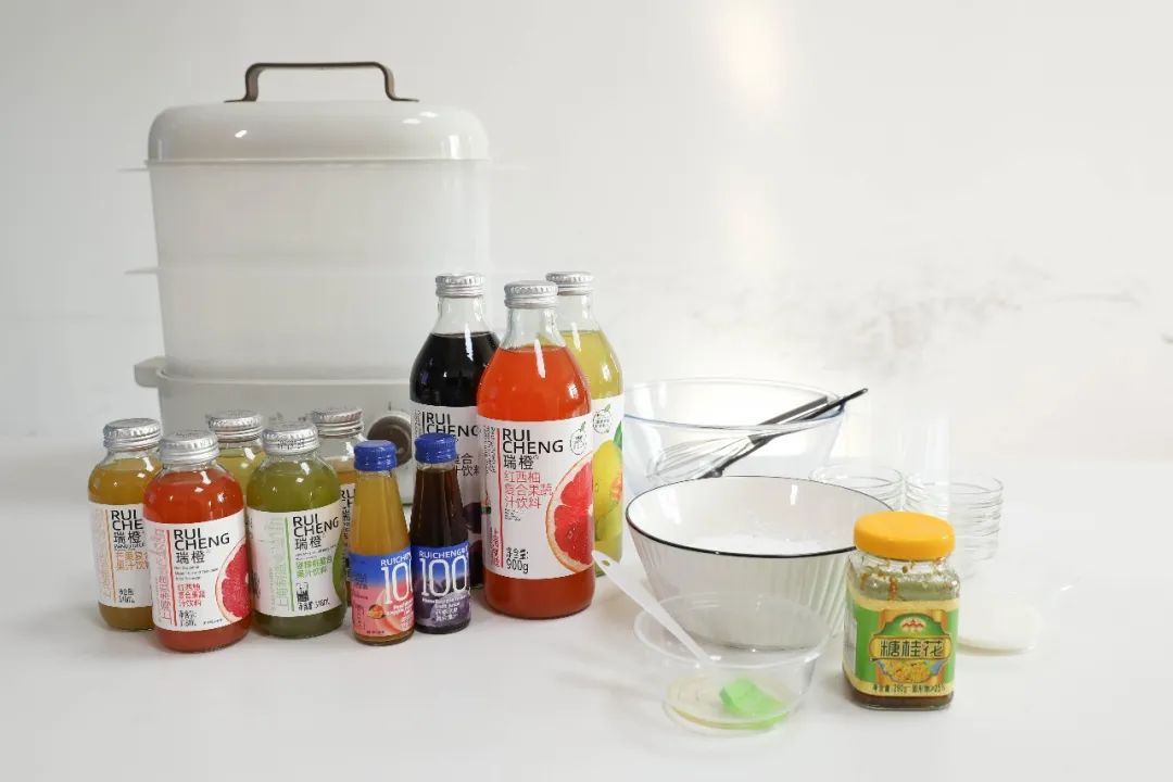 所需食材比较简单,只需瑞橙的果汁、钵仔糕预拌粉、纯净水和白糖或者糖桂花即可。