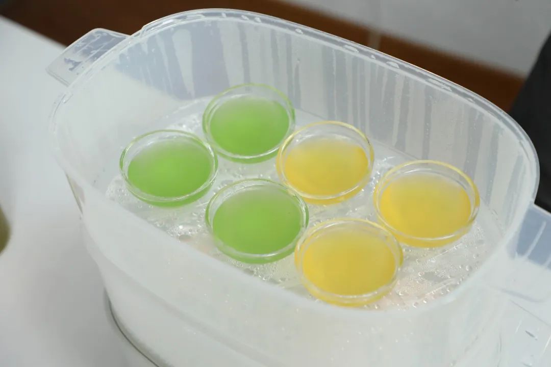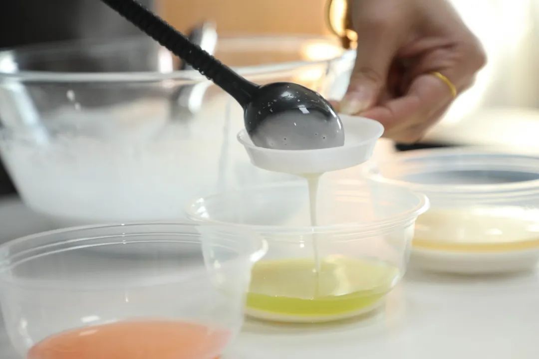 之后需要给每个钵仔碗刷上一层油,方便稍后蒸完脱模。选择自己喜欢的配料水果、糖桂花等放到钵仔碗底,再将过滤好的白浆倒入碗中。