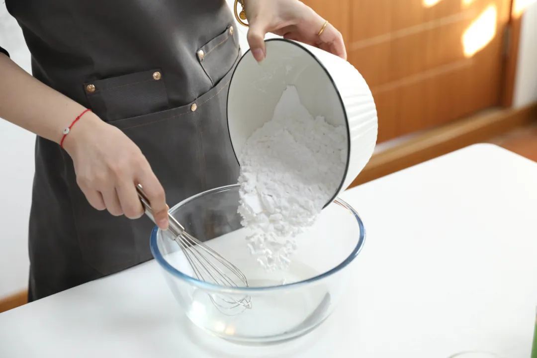 再将200g的钵仔糕预拌粉倒入刚刚的糖水中一起搅拌均匀成白浆。搅拌的时候可以分批加粉,充分让粉化开。