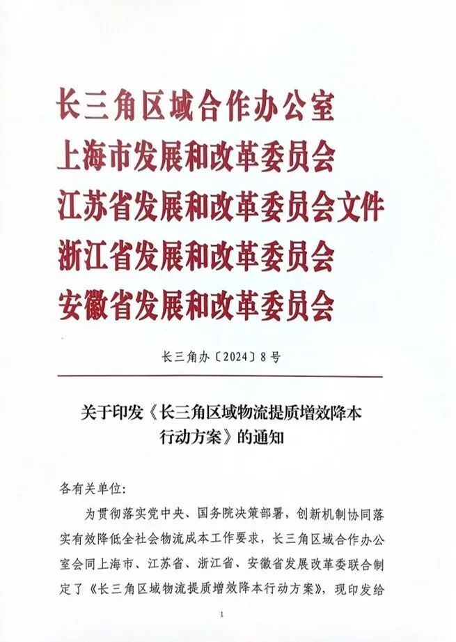 为贯彻落实党中央、国务院决策部署,创新机制协同落实国家层面有效降低全社会物流成本工作要求,推动降低长三角区域物流成本、提高经济运行效率,长三角区域合作办公室、上海市发展改革委、江苏省发展改革委、浙江省发展改革委、安徽省发展改革委联合印发《长三角区域物流提质增效降本行动方案》,明确了7方面37项具体举措。
