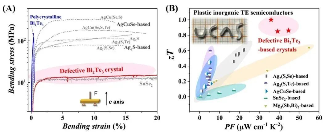 图1 具有高密度/多样化微结构的塑性Bi2Te3晶体的(A)三点弯曲应力-应变曲线和(B)热电性能