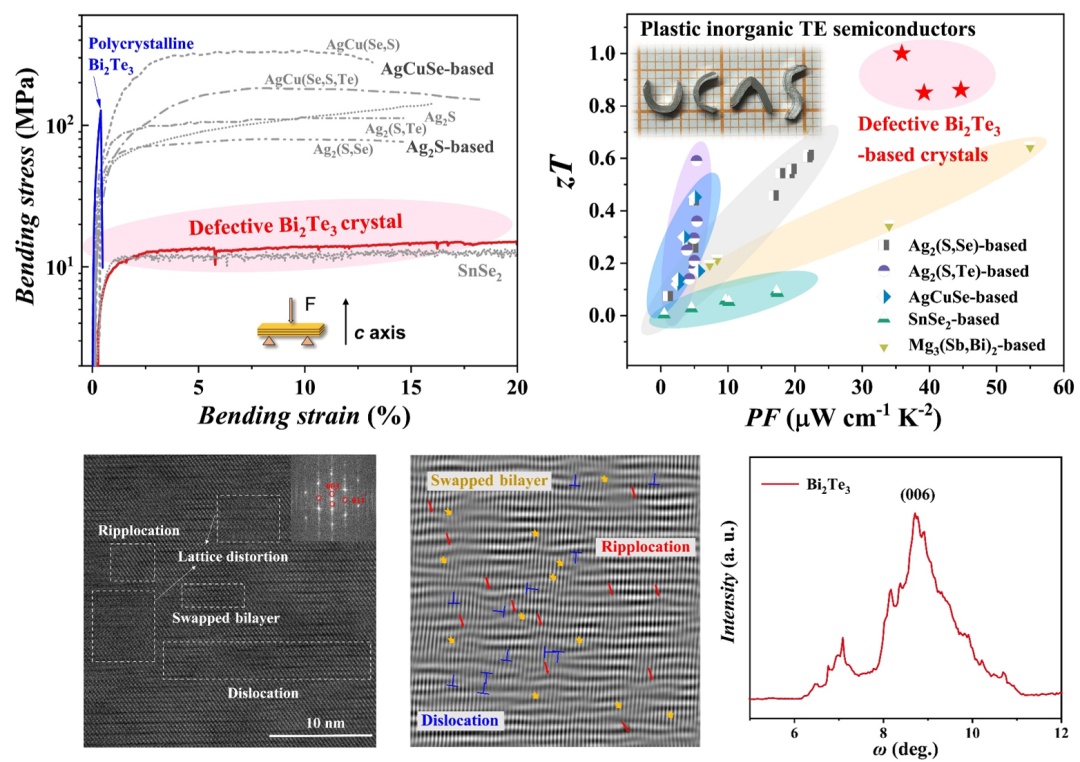 发现在脆性碲化铋(Bi2Te3)基材料中通过调制反位缺陷诱导形成高密度/多样化的微观结构,实现了材料从脆性至塑性的转化,将塑性热电材料的室温热电优值提升至约1.0,与传统脆性热电材料相当