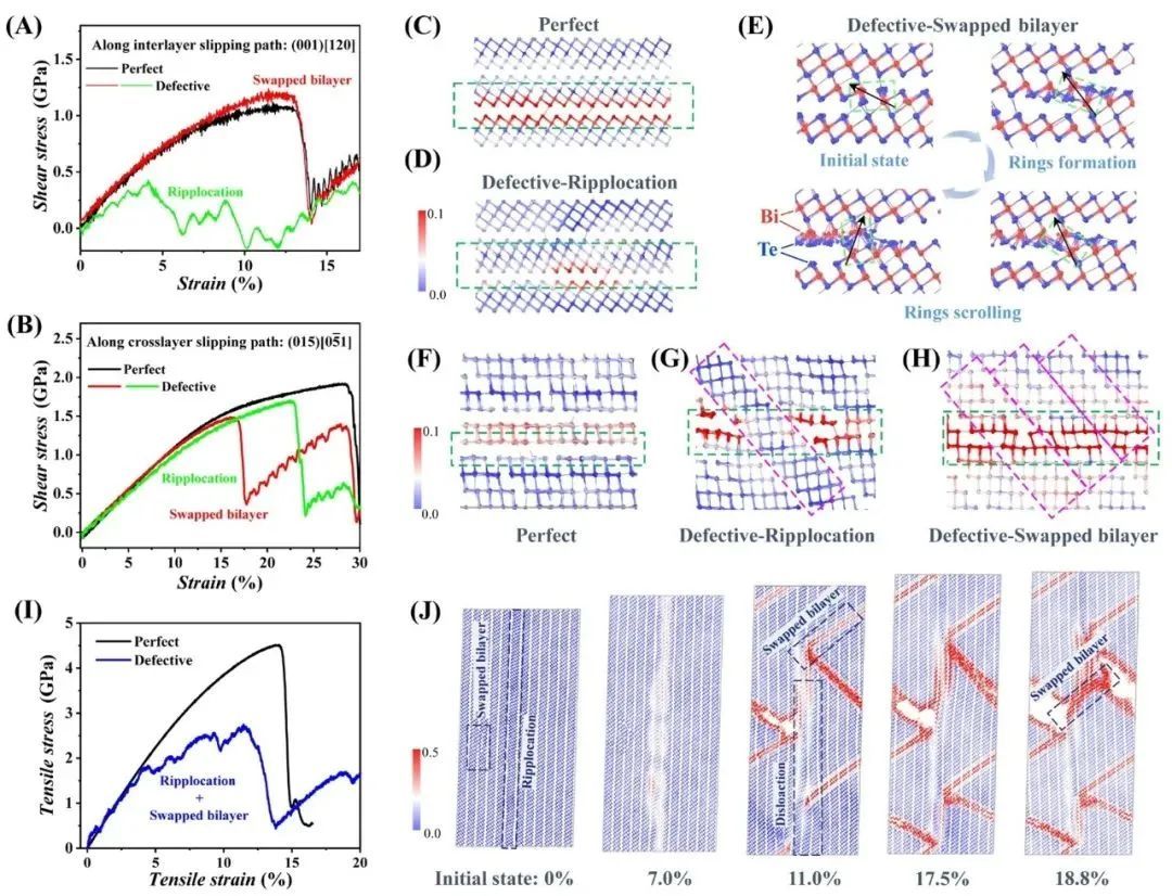 以交错层和涟漪两种微结构为例,利用分子动力学计算揭示了其对力学性能的影响。在缺陷Bi2Te3单晶中,范德华层间存在Bi-Te化学键,且原子剪切应变分布不均匀,表明剪切过程中存在原子的局部位移。层间Bi-Te化学键可以作为桥梁连接近邻的范德华层以强化层间相互作用和抑制层间解理。