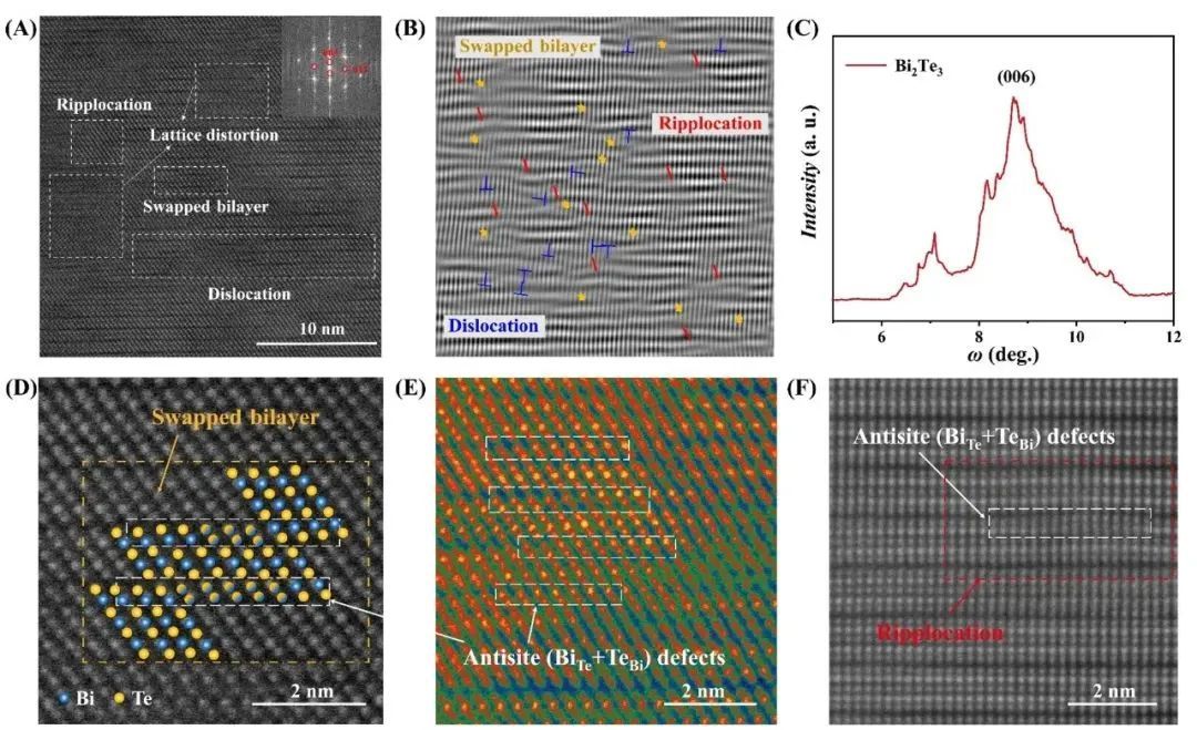 力学性能测试表明,Bi2Te3块体单晶沿面内方向的三点弯曲应变量>20%,压缩应变量>80%,拉伸应变量约8%,与已报道的塑性无机非金属材料相当,远高于脆性多晶Bi2Te3材料。透射电镜表征发现Bi2Te3单晶中存在由BiTe和TeBi反位缺陷转变而成的高密度/多样化的微结构,如线缺陷(位错、涟漪)或面缺陷(交错层、超位错)甚至局部晶格畸变等。