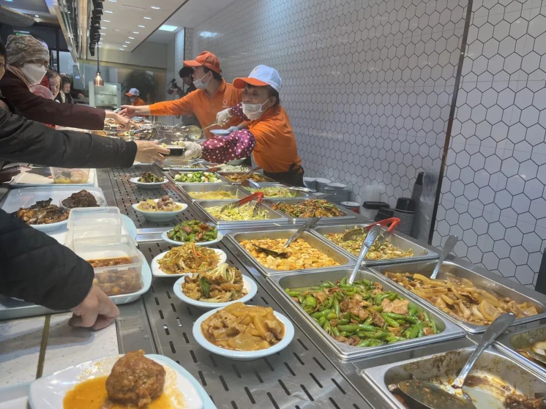 营业时间一到,居民杜先生带着九十多岁高龄的父亲排到了队伍的前列。“我们现在都是在外面社区食堂解决,老人家吃也吃不了多少,家里烧也麻烦,今天这家新开业,我们就来尝尝味道。”杜先生一边和记者聊天,一边用目光锁定父亲爱吃的几道菜,接连放入餐盘。