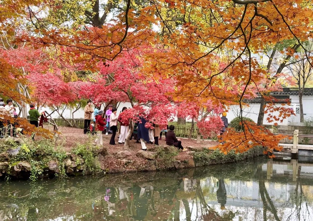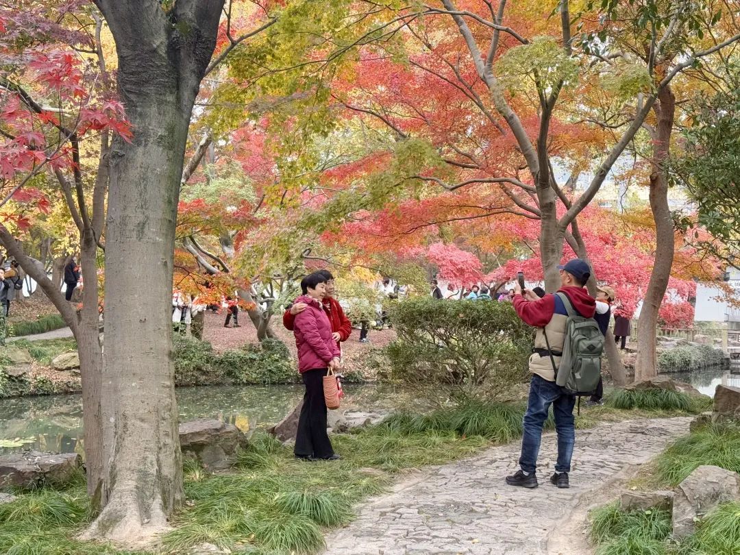 在园中,红、黄、棕、橙等色彩交织,仿佛一块调色盘,为初冬的萧瑟带来了一抹别样的古韵。游客们或驻足欣赏,或举起手机、相机,争相记录下这份令人心动的美景。