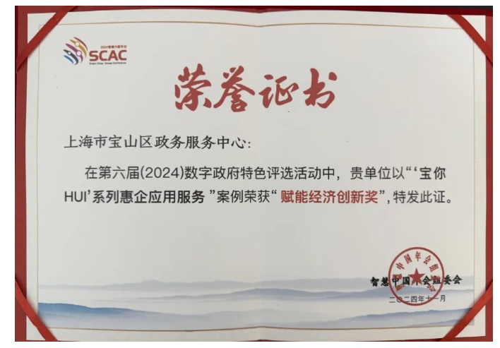 近日,在2024年全国数字政府特色案例评选活动中,上海市宝山区提交的“宝你HUI”系列惠企服务应用案例,凭借多元化的应用场景、出色的服务效能,以及在优化营商环境方面所作出的突出贡献,荣获“赋能经济创新奖”。该项荣誉标志着宝山区在打造政务服务品牌上迈出了坚实的一步,并赢得了广泛赞誉与高度认可。