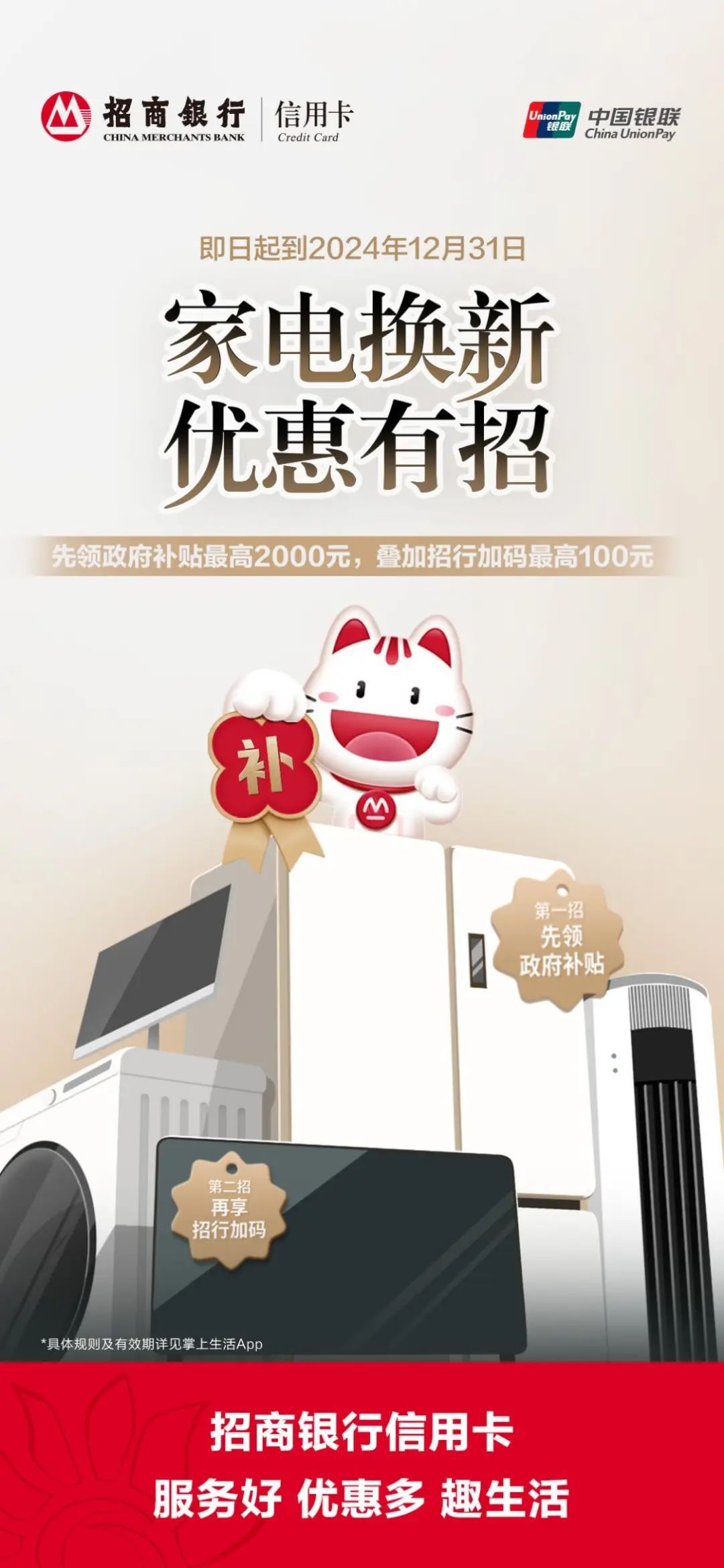 近期,招商银行信用卡在国家“以旧换新”财政补贴的基础上进一步加码,为消费者提供60元-100元的额外优惠。客户在活动指定的门店,使用62开头招商银行银联信用卡付款,可享受以旧换新招行专属加码补贴,目前已覆盖广东、深圳、浙江、湖南、四川、重庆、大连、福建、厦门、陕西、吉林等11个地区,将优惠传递给更多持卡人。为充分挖掘购车需求,促动客户汽车消费意愿,招商银行信用卡还积极试点灵活调整汽车分期产品首付比例,并开展线上、线下限时补贴活动,成功助力上万客户优惠购车。
