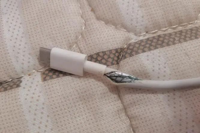 一些老旧、劣质充电数据线由于长期使用,会出现表皮破损、内部绝缘物质老化等现象。使用破损的数据线充电,不仅容易出现短路现象,引发火灾;当数据线内部金属线裸露时,还可能漏电。
