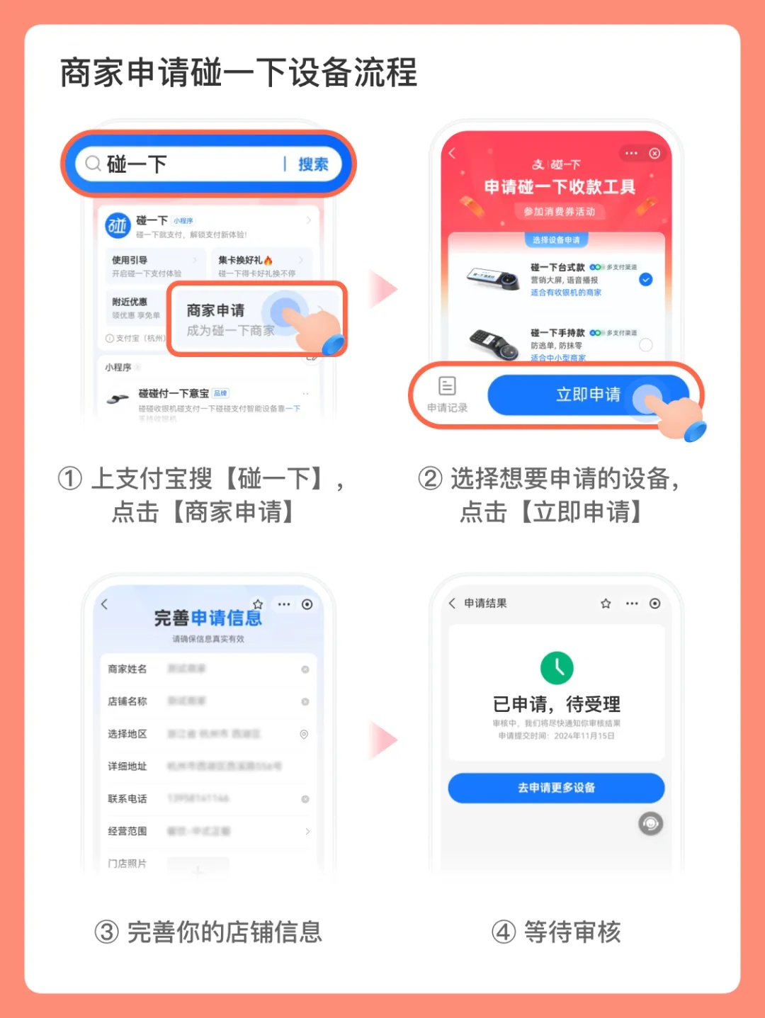 想成为碰一下商家、支持消费券核销的商户,可以上支付宝App搜索“碰一下”,点击“商家申请”,提交申请后,将有专人联系商家上门免费安装碰一下收银设备(收银机连接款)、碰一下点餐桌贴。也可按需选择碰一下收银设备(手持款)。