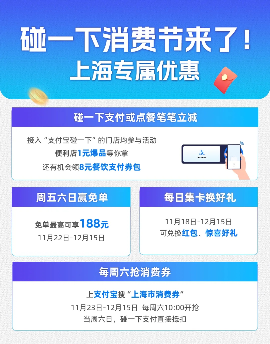 据悉,11月23日起,“碰一下消费券”连续四个星期的周六上午10点开始发放。目前,通过“支付宝碰一下”,用户解锁手机后,不用打开支付App、直接碰一下商家收款设备,最少一步完成支付。爱尝鲜的年轻人喜欢“碰一下”这种新潮支付方式,老年人和视障群体无需先找付款码就能付,大幅降低了使用移动支付门槛。外籍来华游客不仅能用扫一下也能“碰一下”支付,更符合日常习惯。