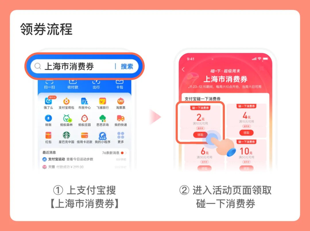 所有定位在上海的人员(包括外地来沪人员),均可上支付宝App搜索“上海市消费券”,进入活动页面领取。