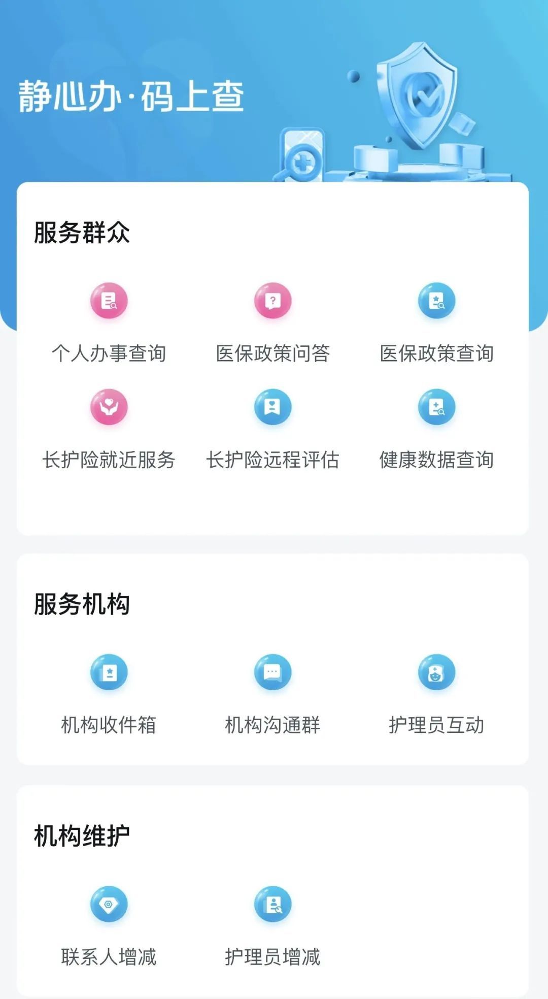 有了服务数据,再通过本区数据超市跨部门共享,依托云上服务器,整合海量信息,以AI深度分析评估,挖掘数据价值,实现了民政、卫生健康委、医保三方对老人和机构的服务、监管的多个场景。同时,开发多元便捷应用,不仅有“旗舰店静安长护险”“静心办”等线上渠道,还有“码上查 ”“云调换”等基于基础数据的随申办、小程序及PC端应用,服务市民、机构、服务人员及政府部门。