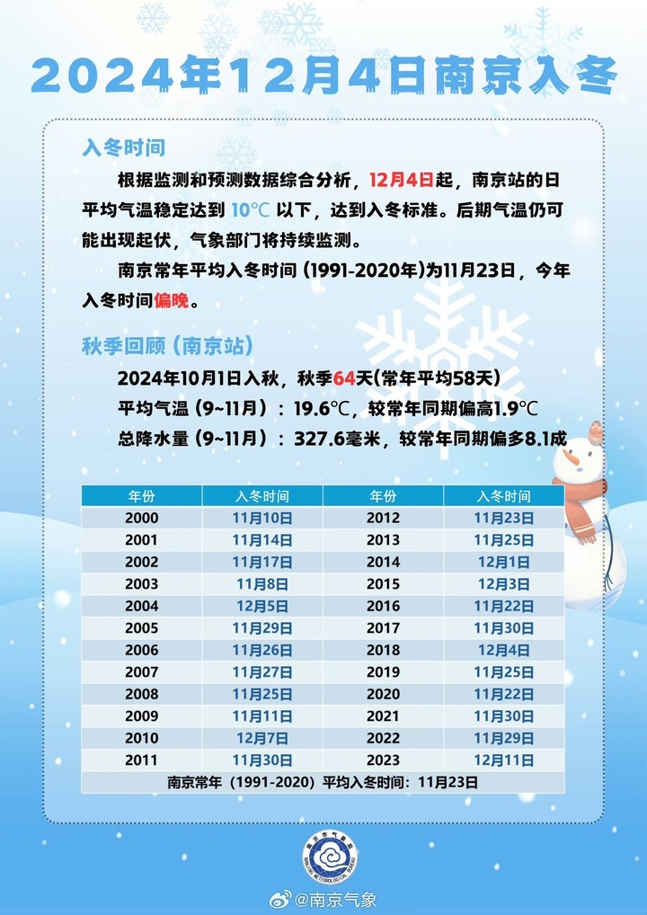 交汇点讯 12月7日,南京市气象台发布官方消息:南京12月4日入冬,根据监测和预测数据综合分析,12月4日南京站的日平均气温稳定达到10℃以下,达到入冬标准,今年入冬时间较常年偏晚,今年秋季累计64天(10月1日入秋)。