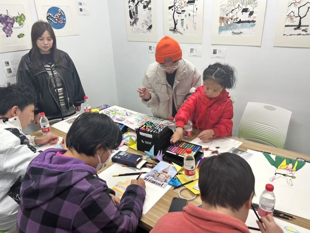展厅中,有一张绘画桌,桌边围着数位特殊群体代表,他们是来自凉城新村街道阳光家园和虹口区密云学校的学员。主办方介绍,这几位学员都特别喜爱画画,平时他们常在老师的指导下练习画画。