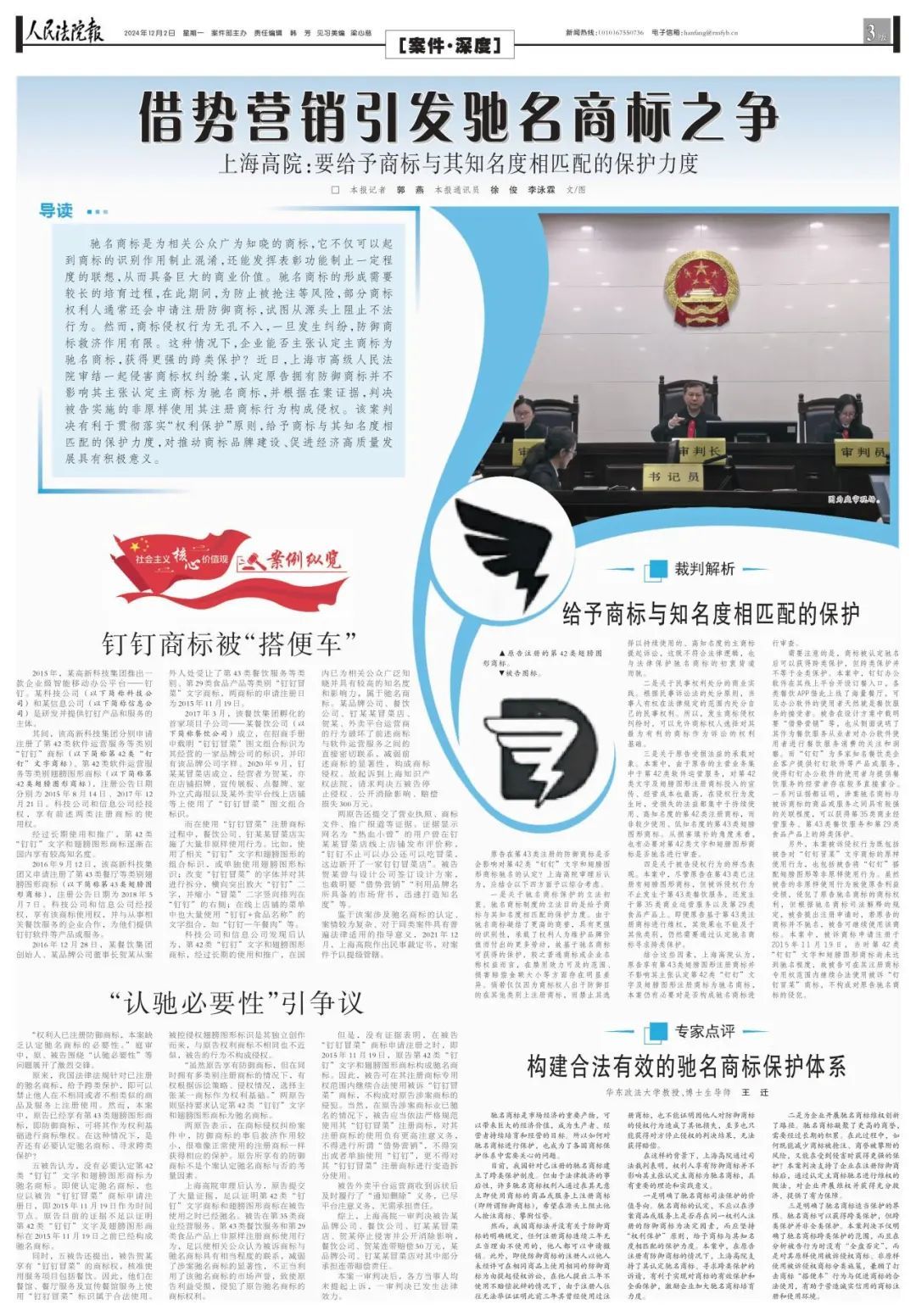 上海高院审理后认为,原告提交了大量证据,足以证明第42类“钉钉”文字商标和翅膀图形商标在被告使用之时已经驰名。被告在第35类商业经营服务、第43类餐饮服务和第29类食品产品上非原样注册商标使用行为,足以使相关公众认为被诉商标与驰名商标具有相当程度的联系,减弱了涉案驰名商标的显著性,不正当利用了该驰名商标的市场声誉,致使原告利益受损,侵犯了原告驰名商标的商标权利。