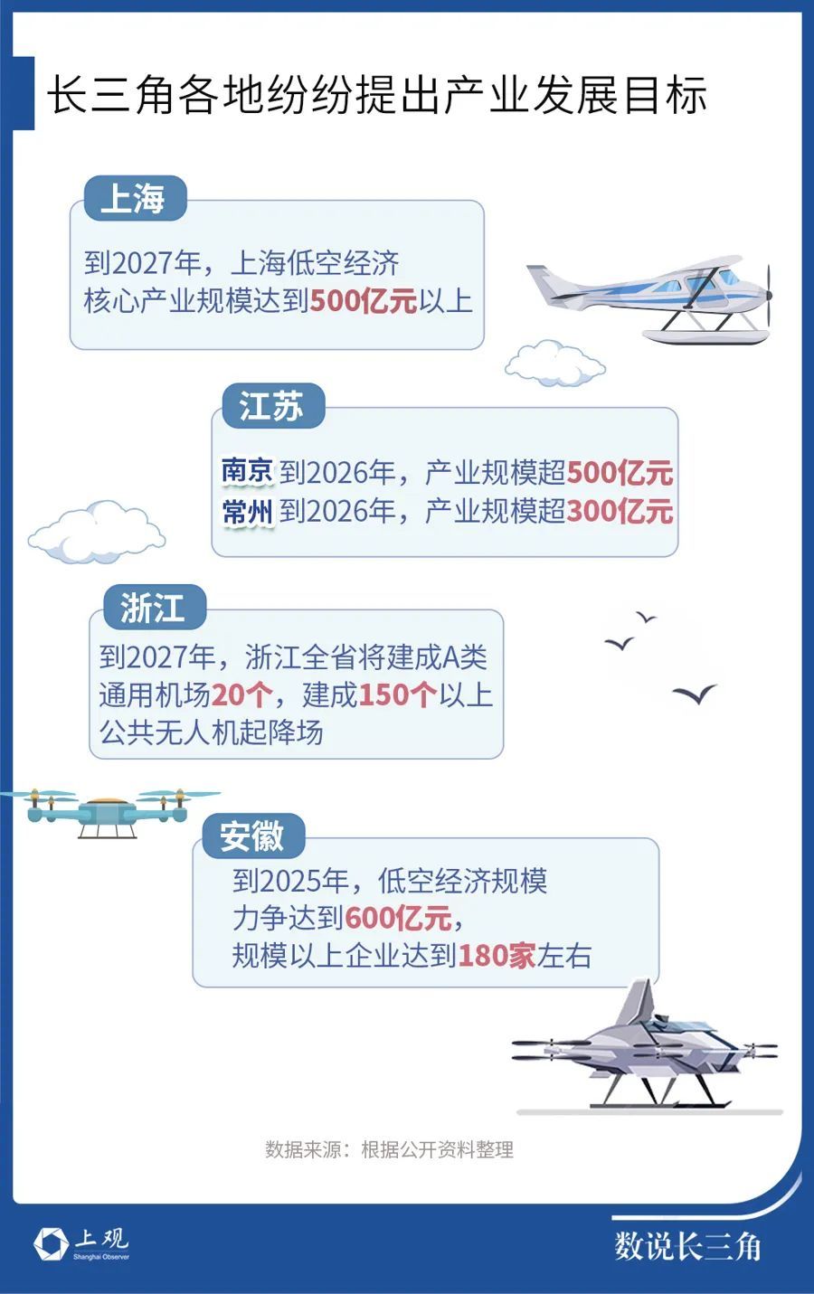 自2024年初以来,低空经济已成为各地政府工作计划中的热词。长三角各城市纷纷加快布局。南京、杭州分别提出要在近三年建设超240个和超275个低空航空器起降场,开通120条和500条以上低空航线。上海也提出2026年实现上海市低空飞行航线全域连续覆盖,支持业务规模化运营。浙江全省到2027年计划建成A类通用机场20个,实现“市市通”;建成150个以上公共无人机起降场,覆盖四大都市区核心区。