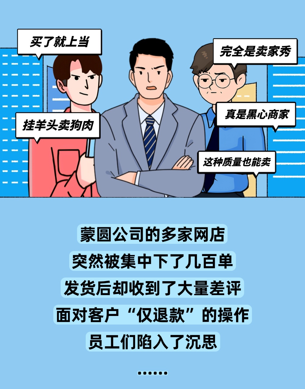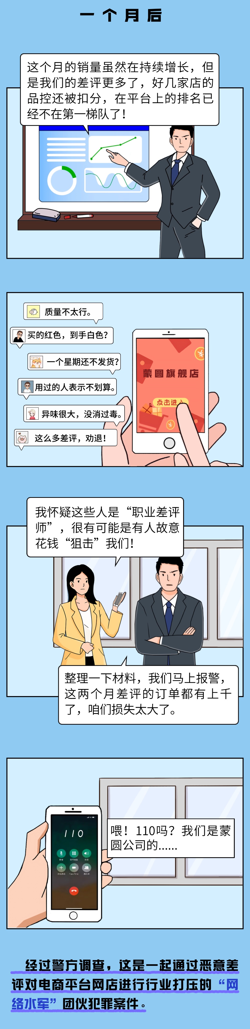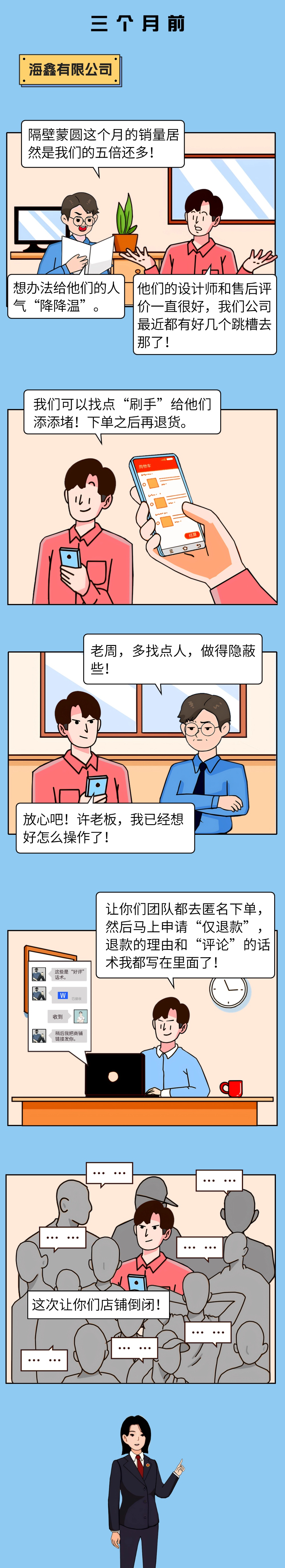 恶意差评不只是道德层面之恶,更触碰法律红线!网络不是法外之地,在互联网上,任何个体或组织都应遵守法律法规,上述漫画中许老板、老周等人为了打击竞争对手,雇用“网络水军”进行“刷差评”等操作的行为,已涉嫌破坏生产经营罪。