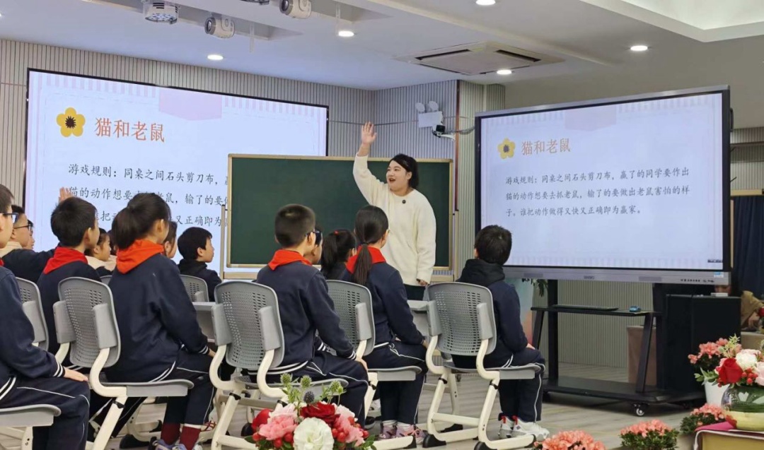 石头剪刀布!和同桌一起玩一个小游戏,赢的同学扮无畏的猫,输的同学扮害怕的老鼠,看谁速度又快,表达的情绪又准确。在建襄小学五年级午会课“情绪魔法帽”中,学生们在游戏中收获了“消极情绪不可避免”“同一件事不同的想法会导致不同的情绪”两个小“锦囊”。