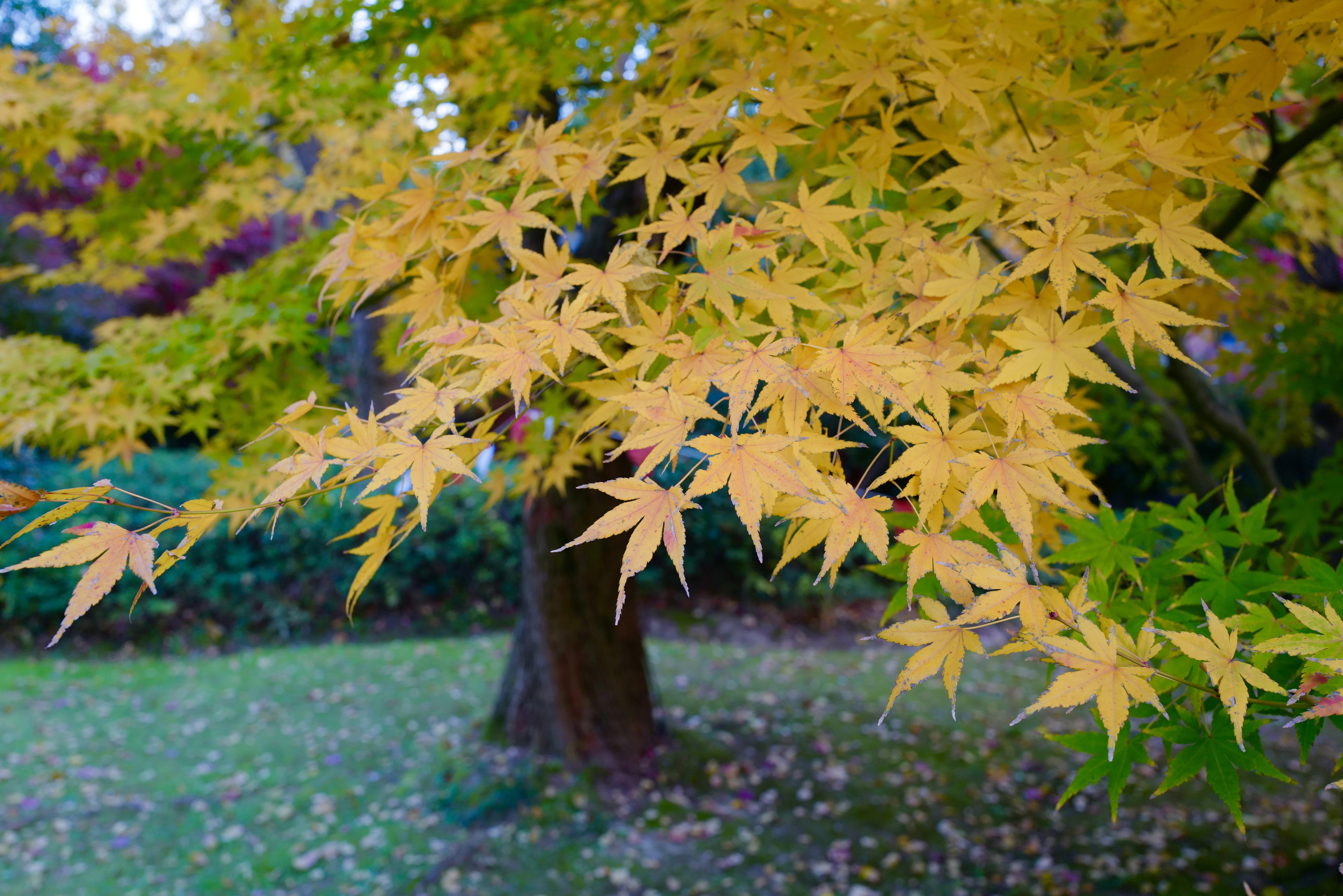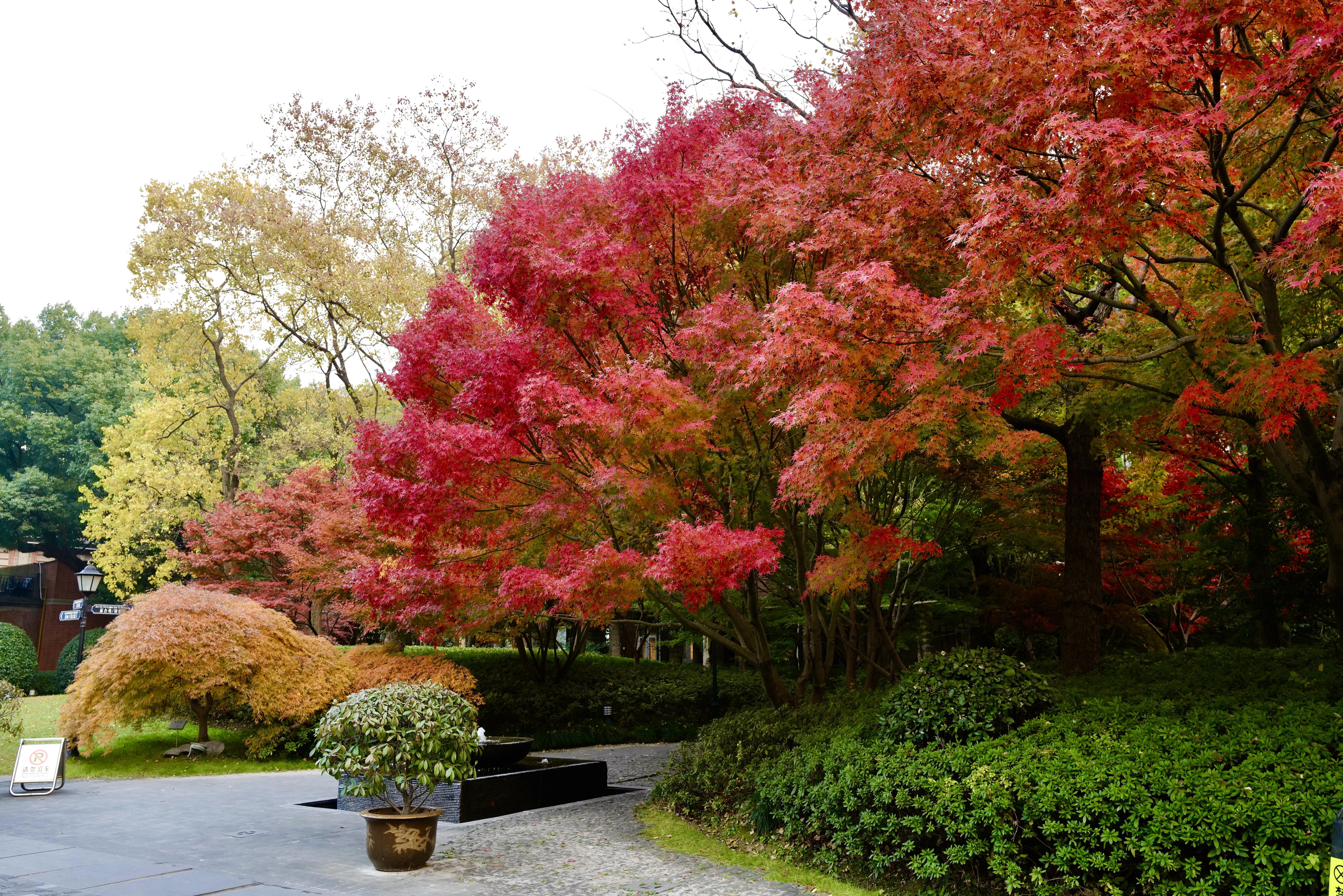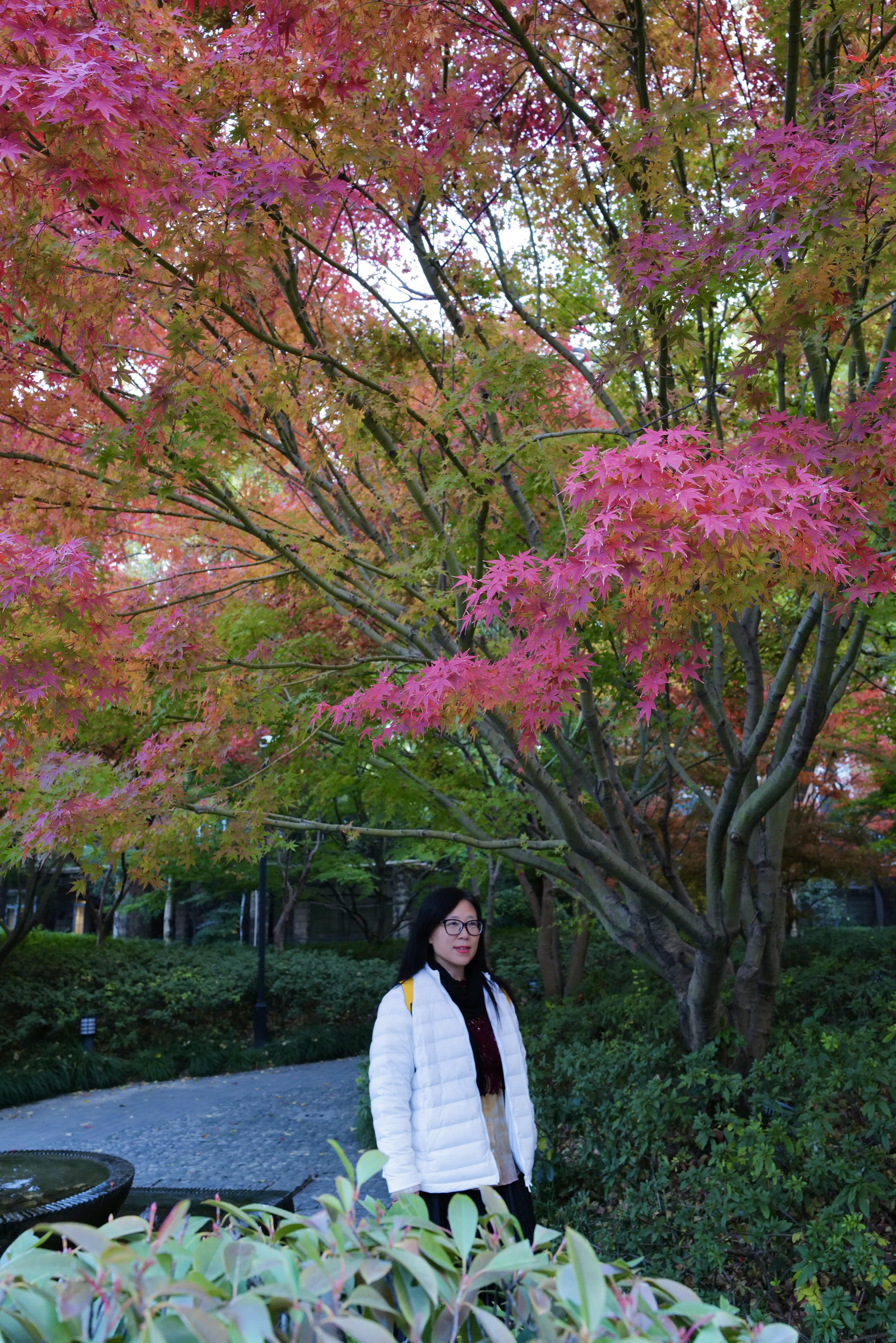 走进大花园,除了那株近九十年的老银杏树外,最惹眼的就是沿途连成片的红枫了。当光线充足的时候,层林尽染五彩斑斓的枫叶让人误以为身处在异国他乡。原来“诗与远方”随手可得,来市中心就能做到。红黄橙绿紫,打翻了颜料盘一般绚丽。