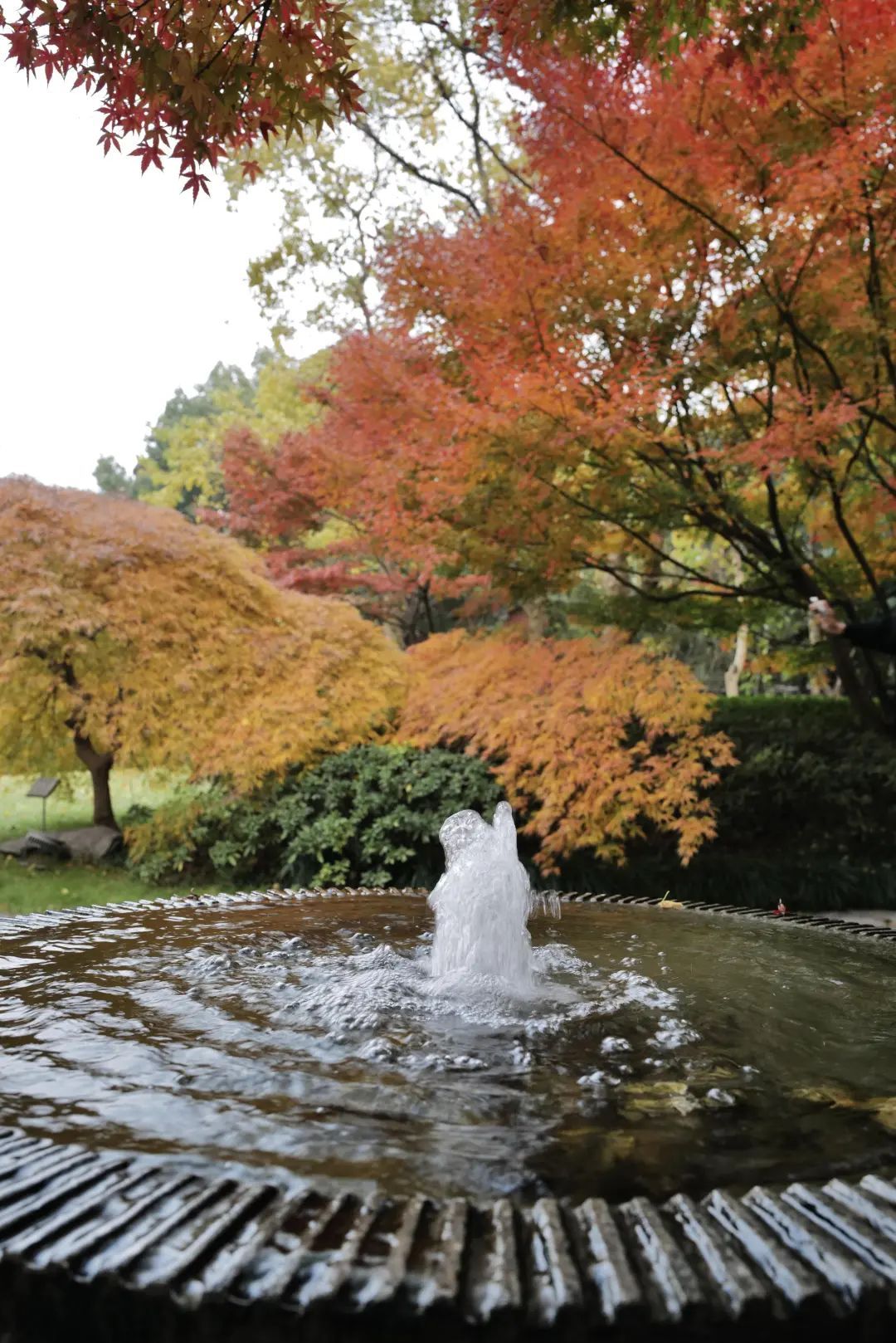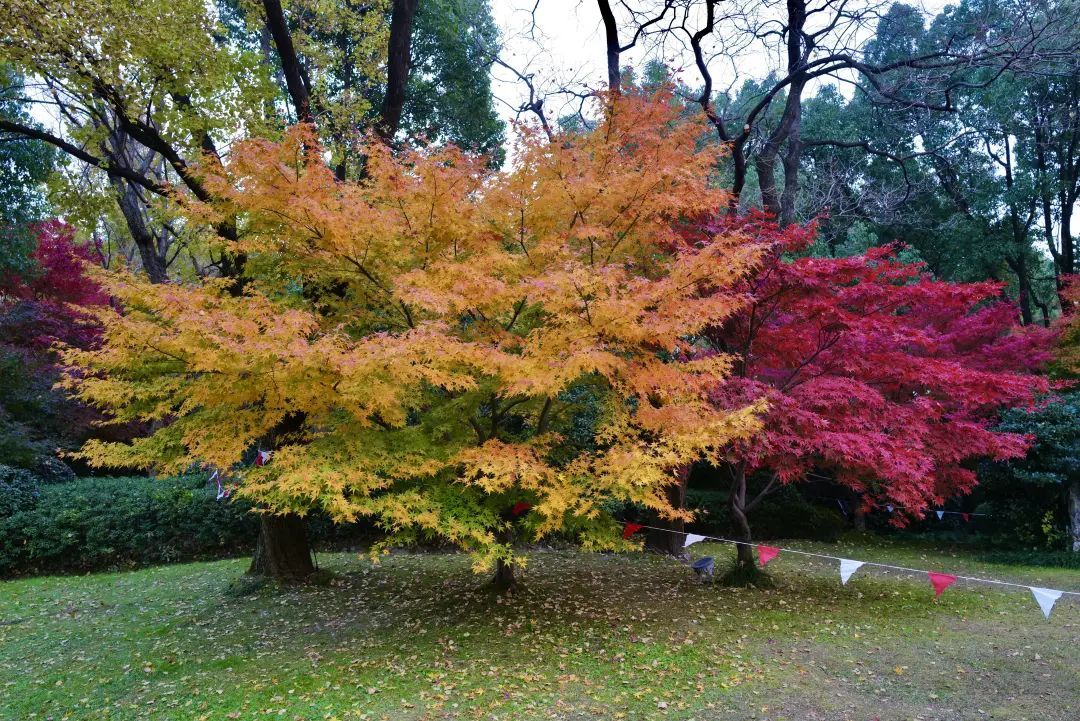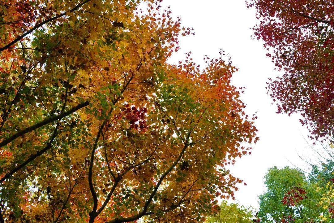 走进大花园,除了那株近九十年的老银杏树外,最惹眼的就是沿途连成片的红枫了。当光线充足的时候,层林尽染五彩斑斓的枫叶让人误以为身处在异国他乡。原来“诗与远方”随手可得,来市中心就能做到。红黄橙绿紫,打翻了颜料盘一般绚丽。