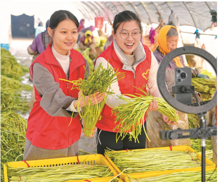 12月8日,在海安市墩头镇长垎村一水芹菜种植基地的分拣现场,党员志愿者当起“村播”,直播销售水芹菜。 周强 摄 (视觉江苏网供图)