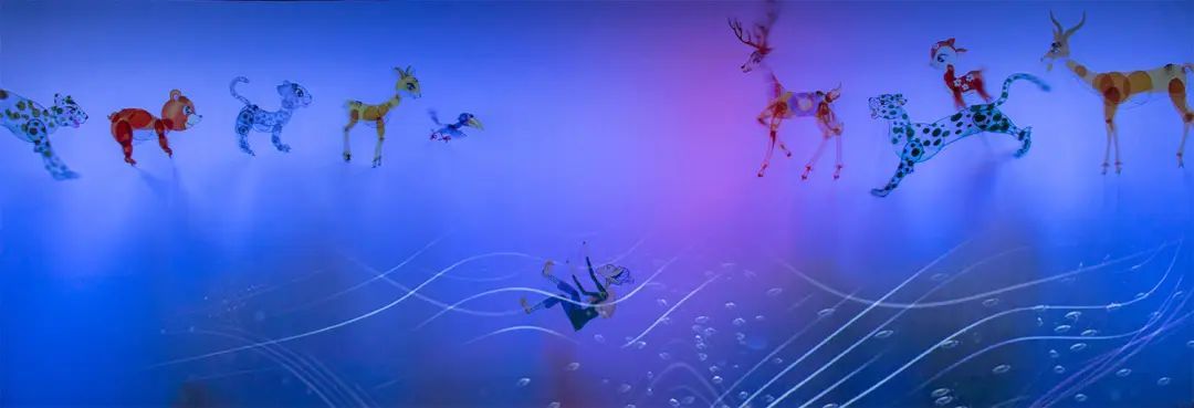 从敦煌壁画获得灵感后,上海木偶剧团将皮影艺术与现代多媒体深度融合,敦煌色系、荧光皮影与传统皮影被创新地结合在一起,打破皮影影窗后操纵的传统表演模式,打造出“影、映、荧”三位一体的海派皮影新印象,让舞台充满惊奇和遐想,给观众营造了极具代入感、沉浸式的观赏氛围,同时也为海派皮影戏增添了新的审美价值与时代共鸣。“既有传统文化韵味,又有创新视觉震撼”是《九色鹿》给所有人留下的印象。
